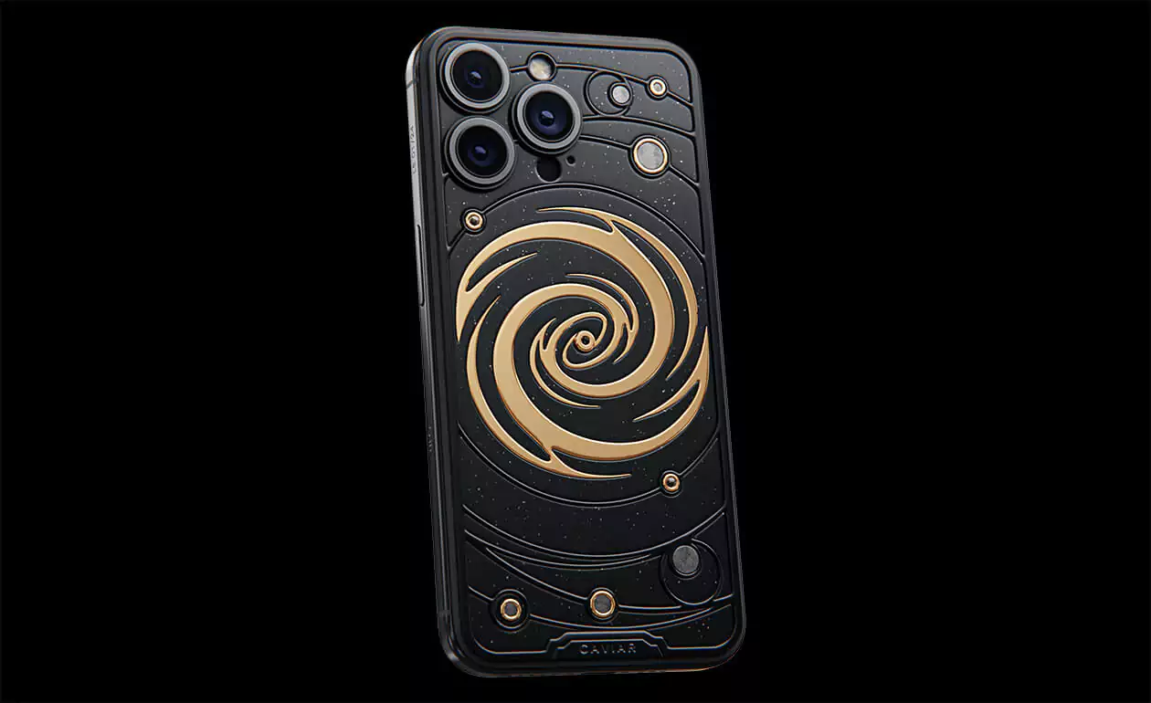 The power of revolving Universe on your phone. Caviar masters incrusted the phone with tiny pieces of ancient meteorites. One of them is Muonionalusta, the most ancient cosmic visitor aged at 4,5 billion years. The gold-plated spiral embodies our galaxy. Are we alone here? Think about it holding iPhone 15 Pro Astral in your hands.