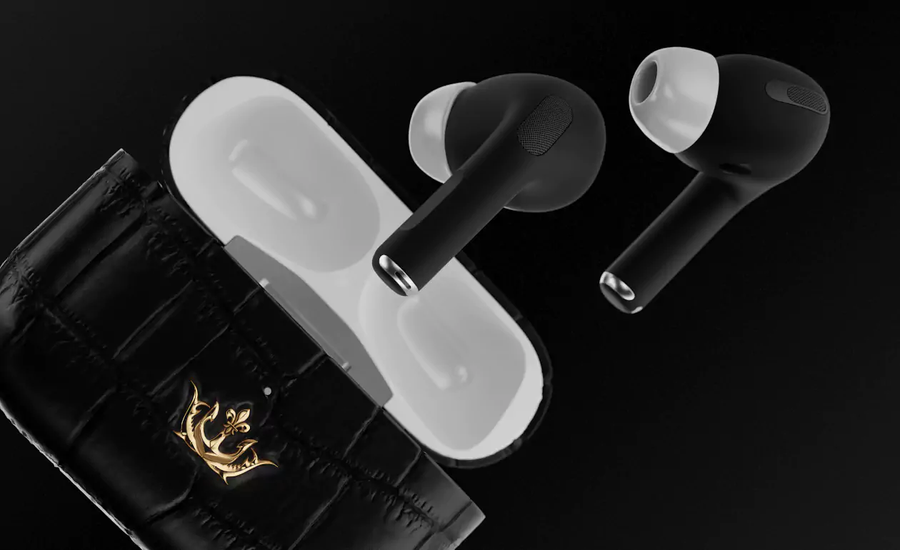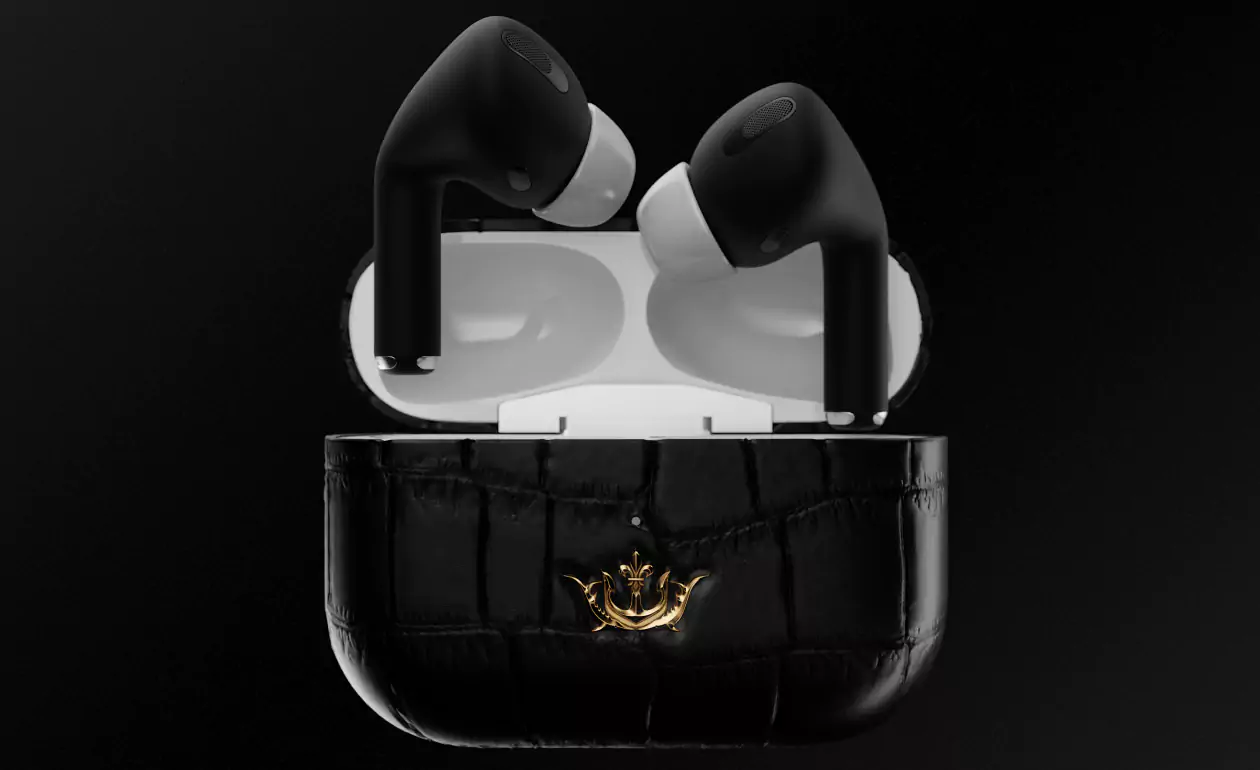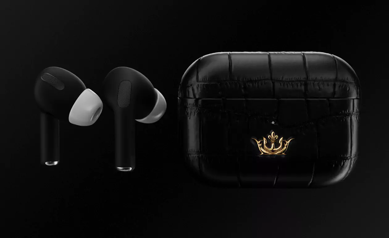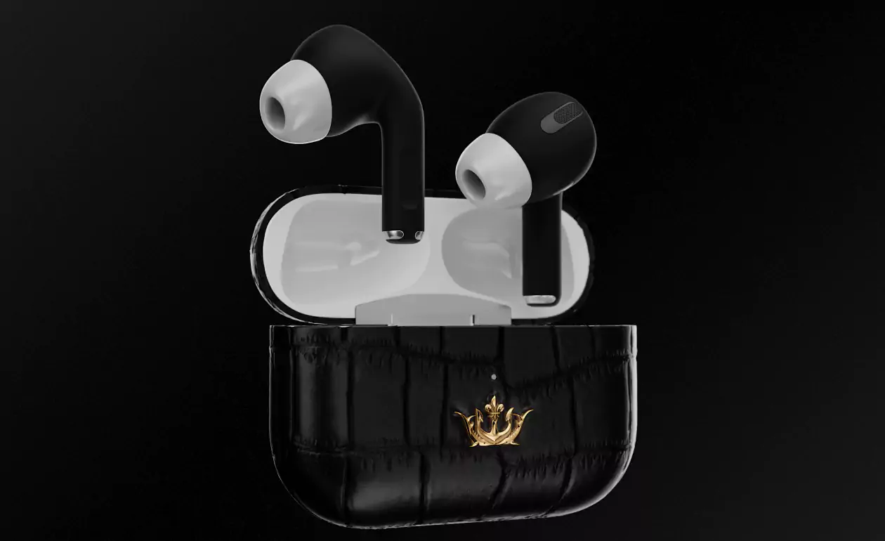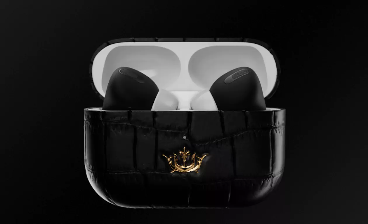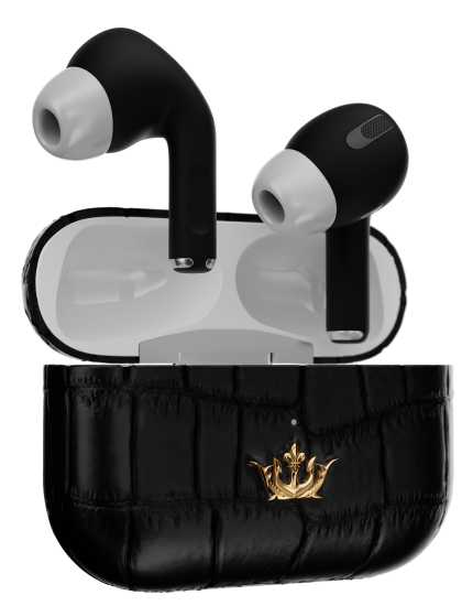 An exclusive luxury-class model of Airpods Pro. The case is made of premium alligator leather of black color, decorated with a jewelry Caviar crown made of goldplated alloy.