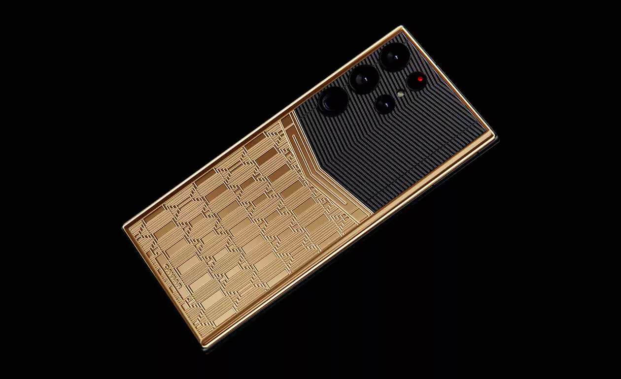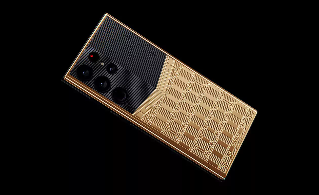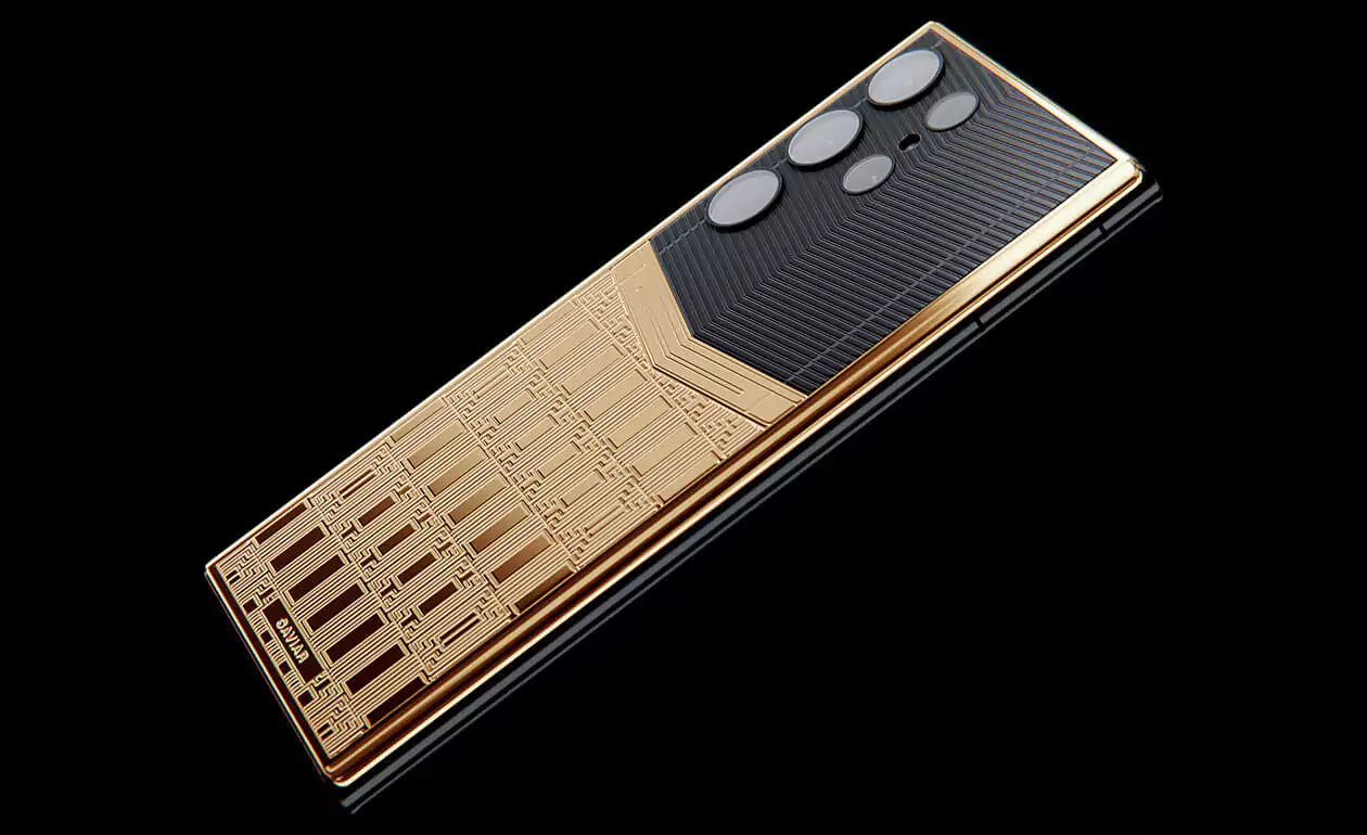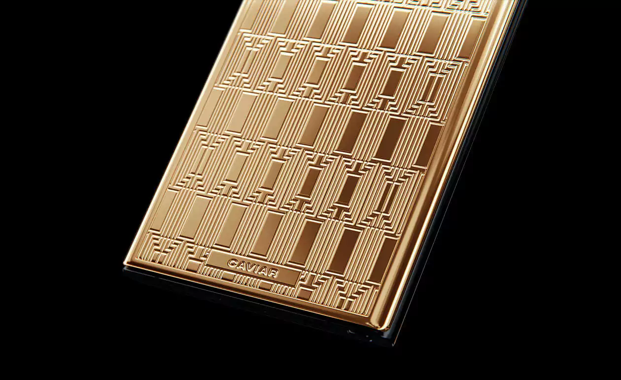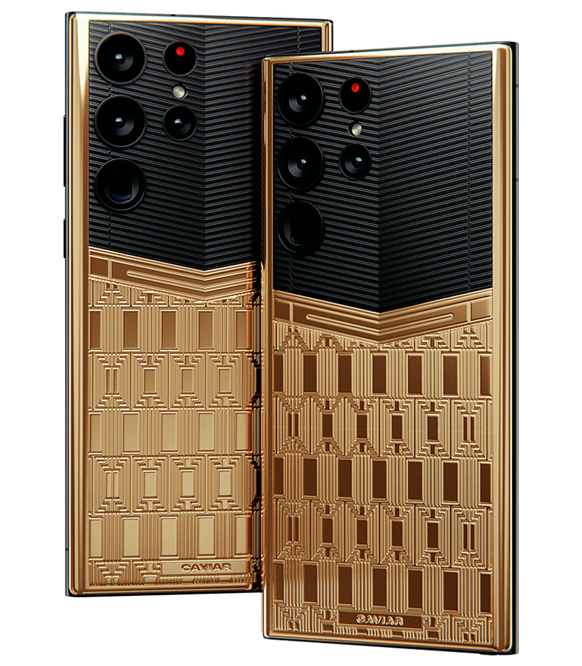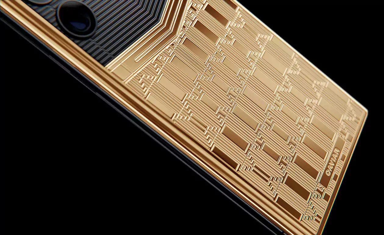 The exquisite design of the Samsung smartphone by Caviar implements the Art Deco style. Its body is made of shock-resistant titanium with a black PVD coating and an eye-catching relief. The back panel is covered with gold of the highest standards and decorated with a voluminous rhythmic pattern, inspired by the grand works of art deco masters.
