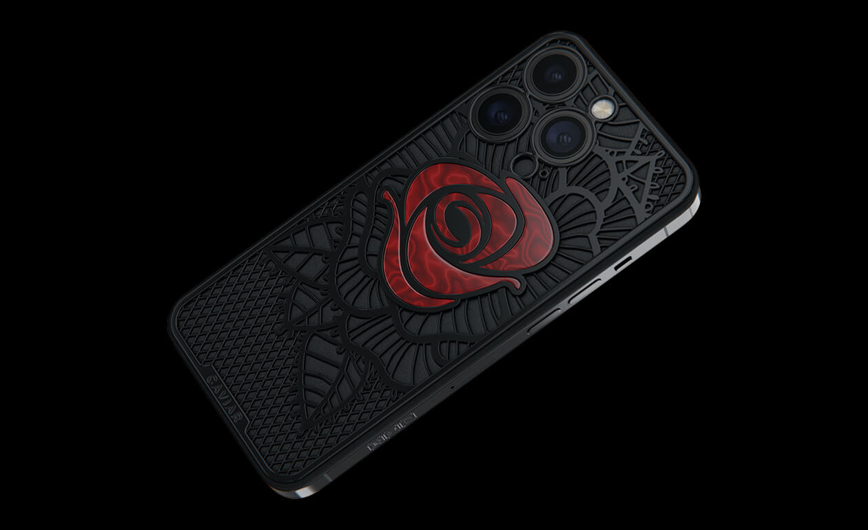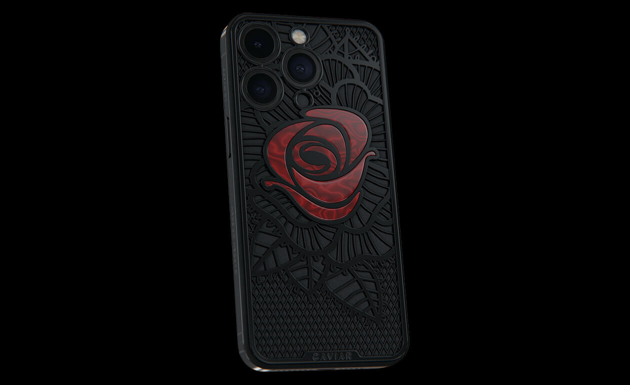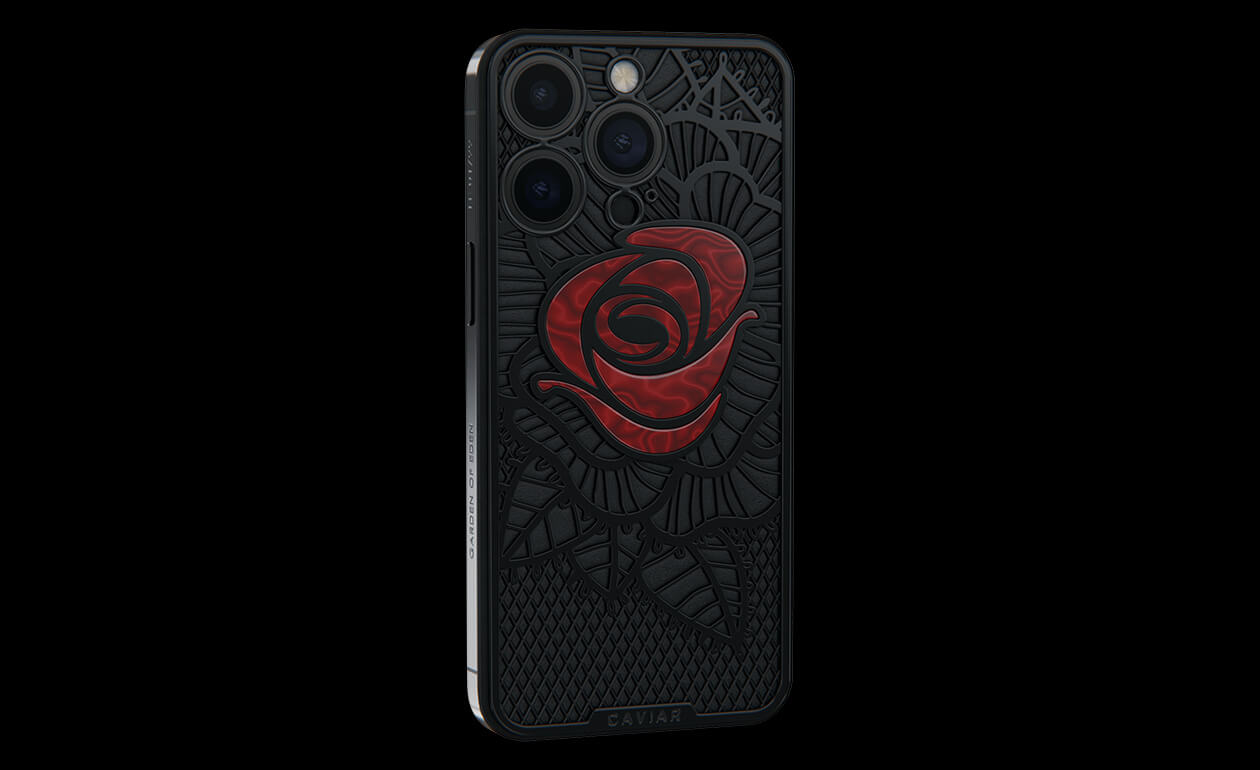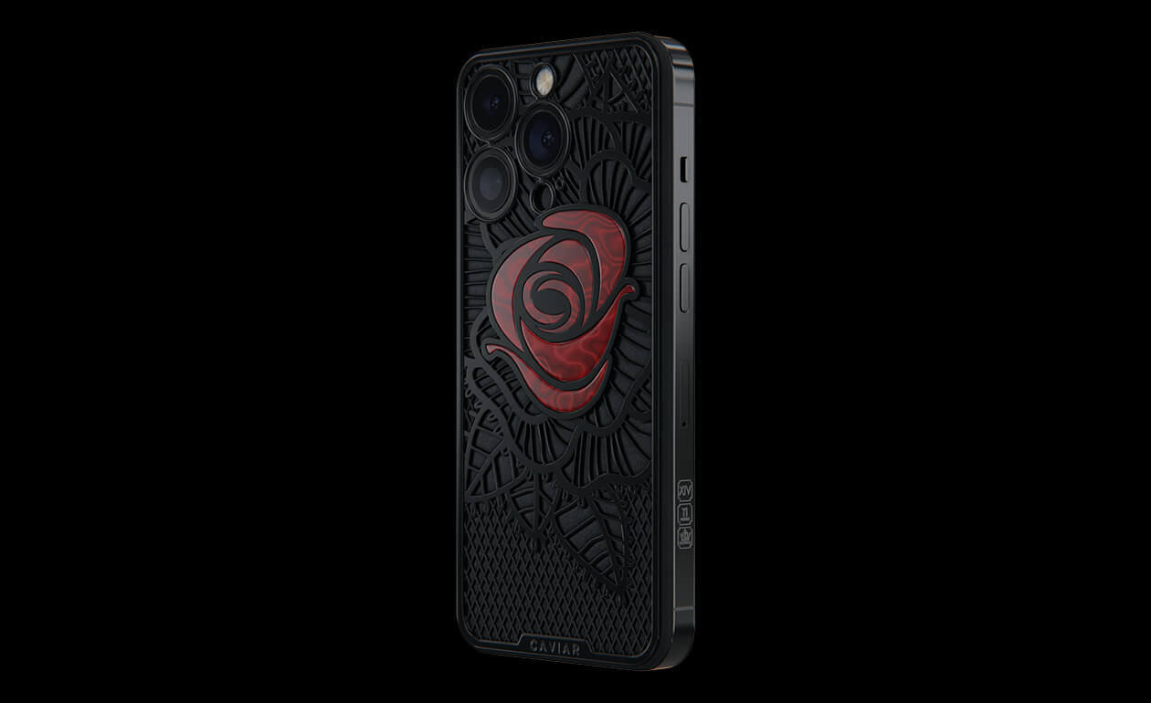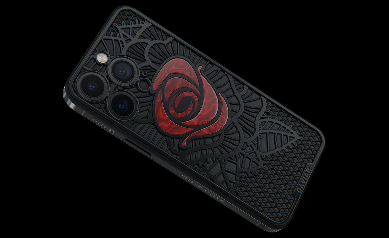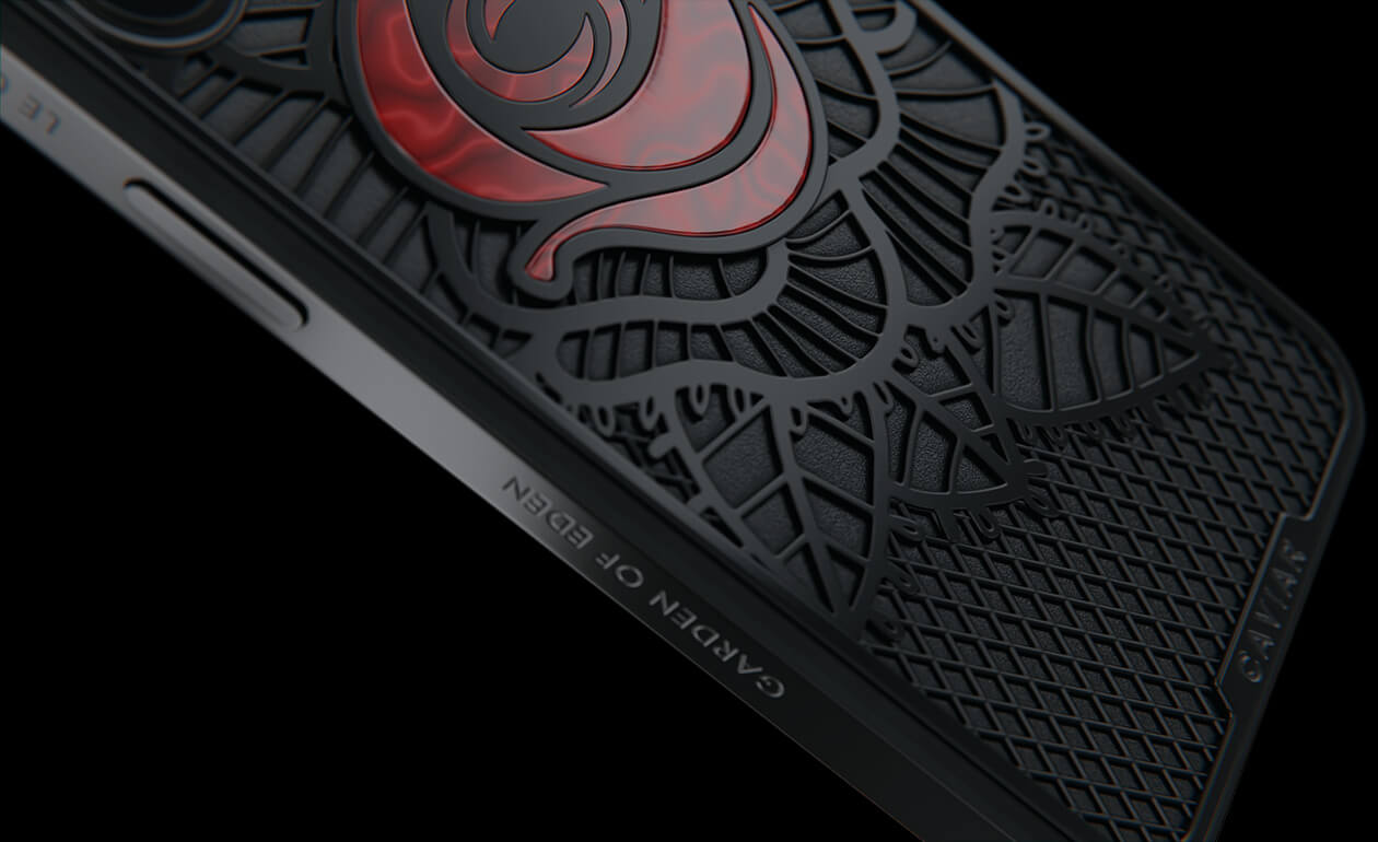Caviar’s designers were inspired by the Old Testament story and created a smartphone with a red rose, which is shaded by black leaves, made of lightweight titanium with PVD coating.