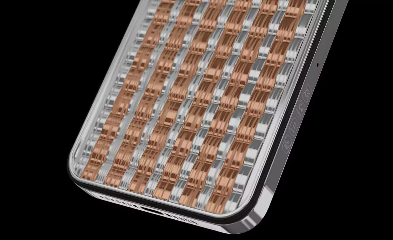 The color combination of the bracelet is embodied with the help of titanium and copper inserts on a picturesque panel in the lower part of the case, while in the upper part a white anti-impact material with an engraving in the form of sea waves is used.