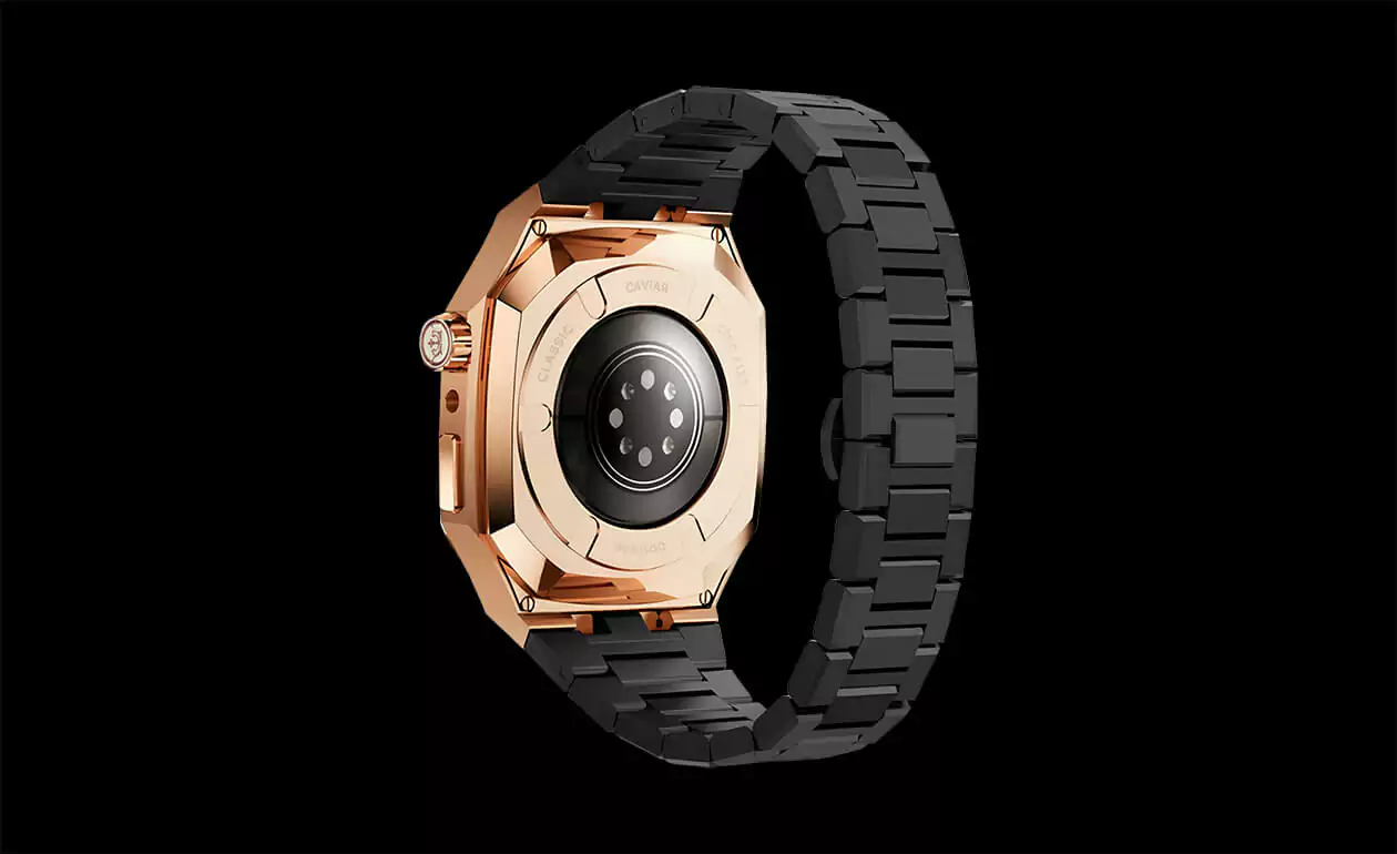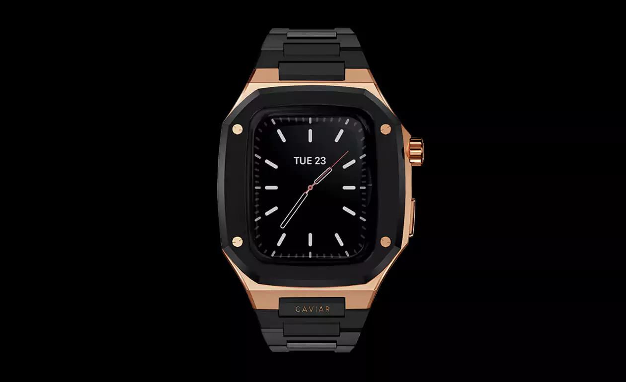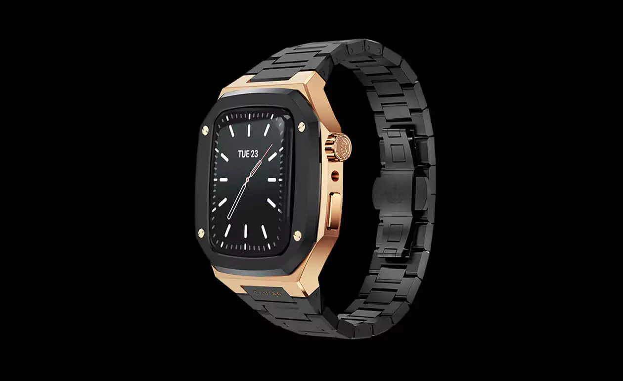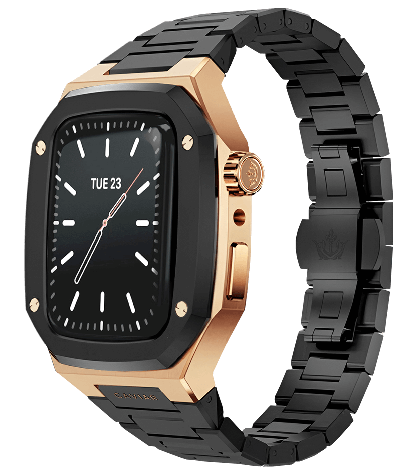 Elevate your everyday style with the Classic Chairman cases for Apple Watch by Caviar. Crafted from 316L stainless steel, this accessory seamlessly combines durability and beauty. The black PVD coating adds an air of mystery, while the rose gold finish brings sophistication and warmth. Make a striking statement with this case, ensuring your watch and your style stand out from the crowd.