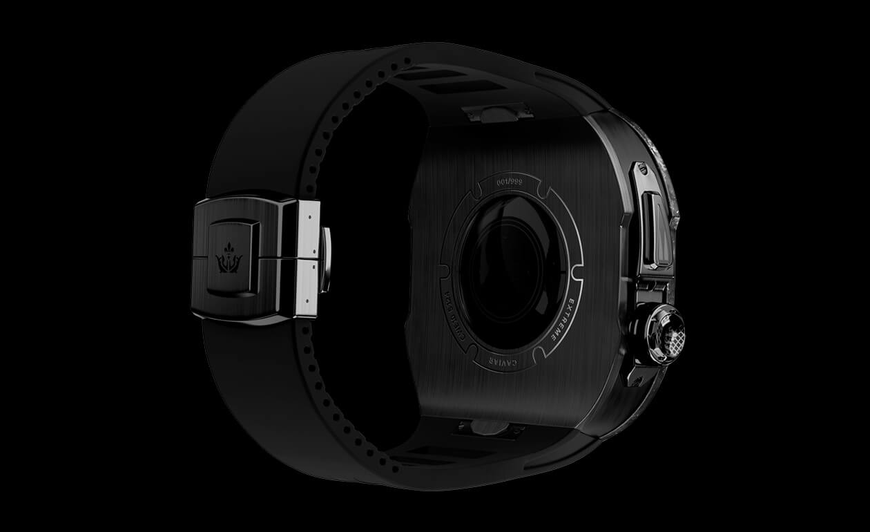 Bezel: The main body of the case is made from automotive carbon fiber, used in the creation of next-generation racing supercars. The side inserts are crafted from impact-resistant titanium with a classic black PVD coating, like those found in the finest Swiss watches.