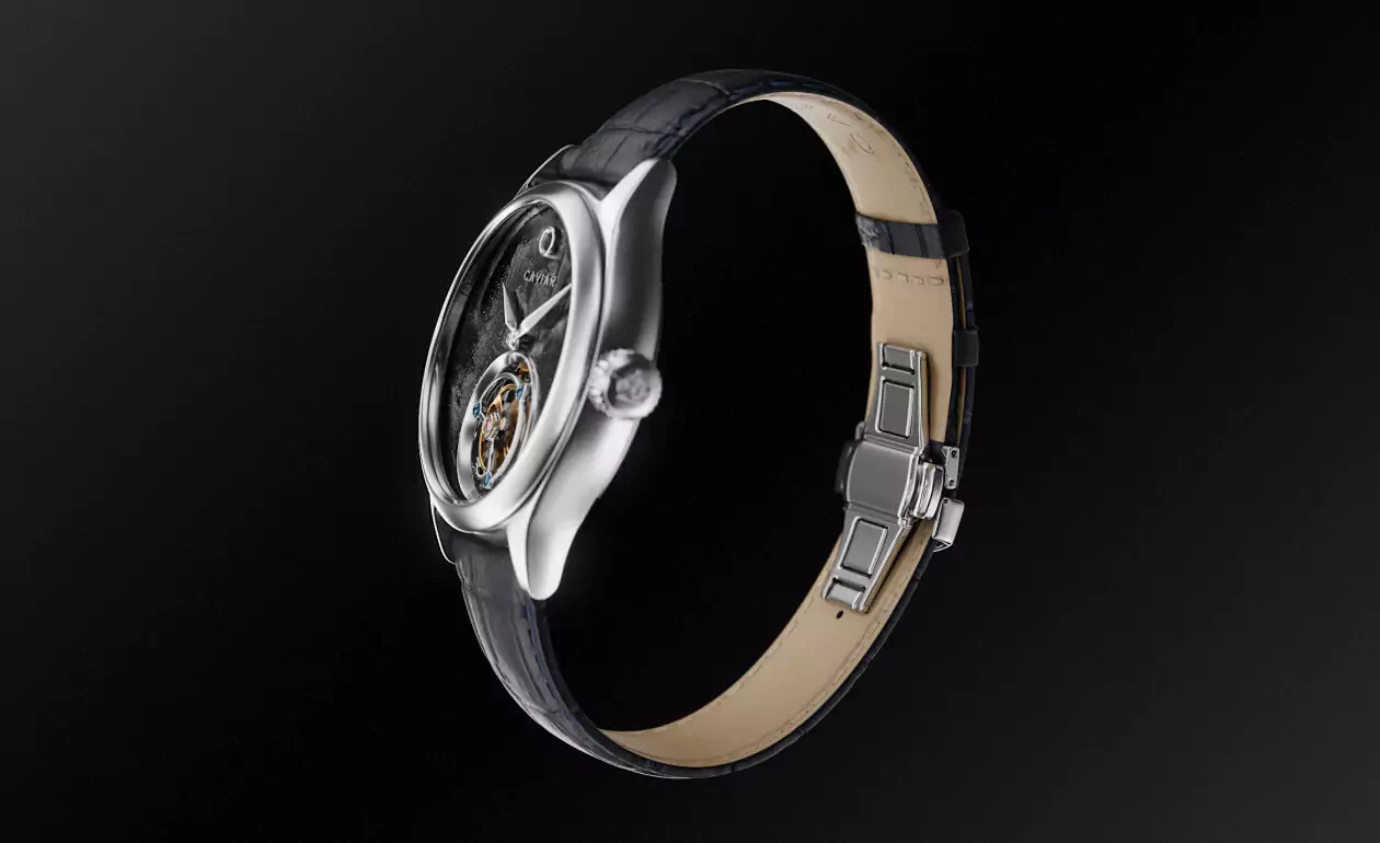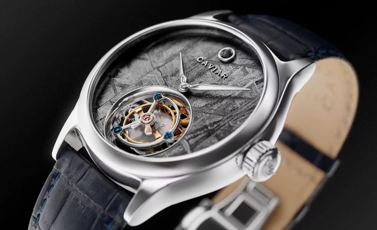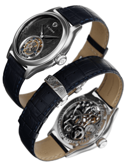The power of two meteorites is enclosed in the limited watch model Caviar Watch Discovery Meteorite: the brutal Muonionalusta that became a basis for the model, and the rare Tsarev meteorite found on the territory of Russia, is placed in the “12 o’clock” position. The watch body of sparkling stainless steel advantageously contrasts with a blue band made of genuine alligator leather. The common color palette comes before us with the extraordinary shades of the cosmic space: the steel shine of far stars, dark blue serenity of the space, and the deep graphite saturation of exceptional meteorites.