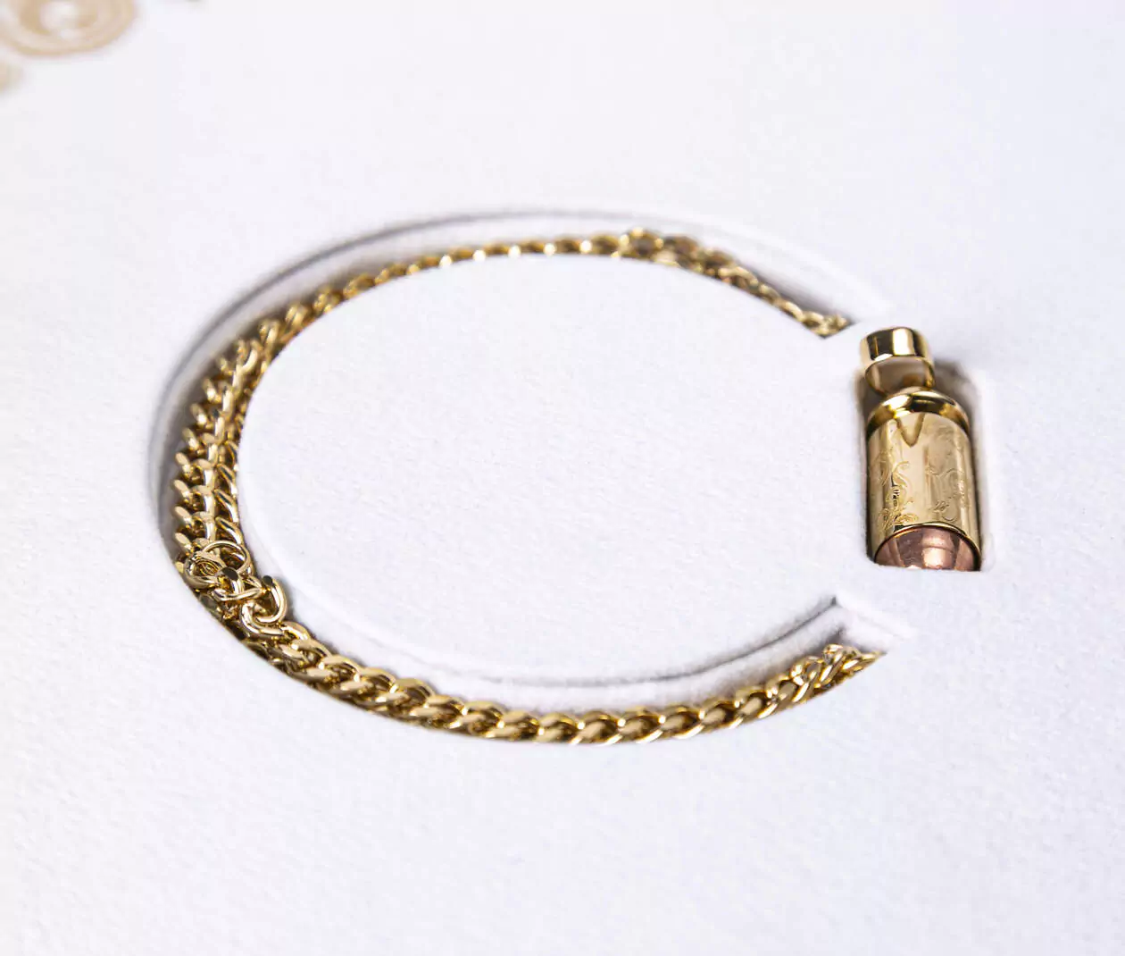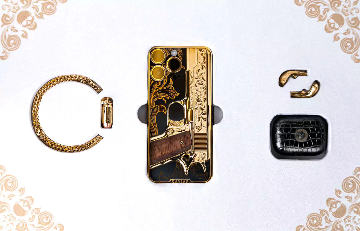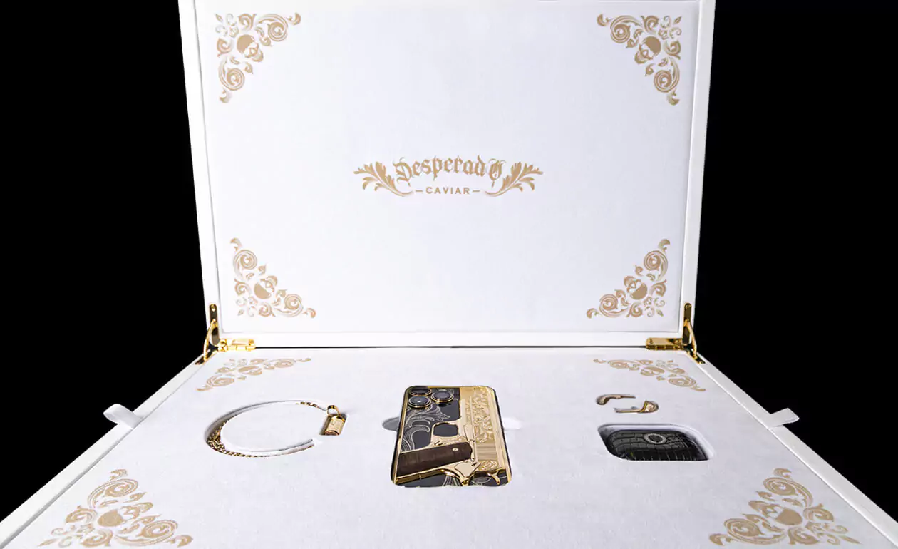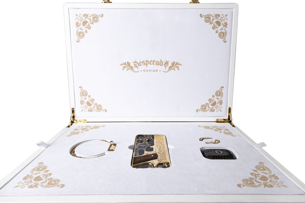Desperado Set is adorned with gold skulls of Calavera. Inside is a gold Colt 1911 on the body of an iPhone 14 Pro, a similar pistol was in the collection of Pablo Escobar. In addition, there are luxurious men's accessories in the set.