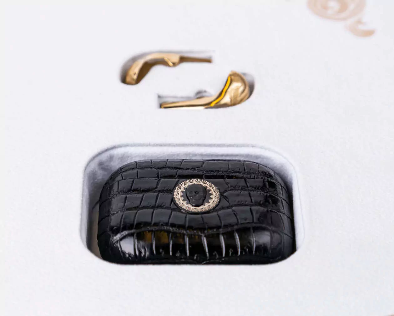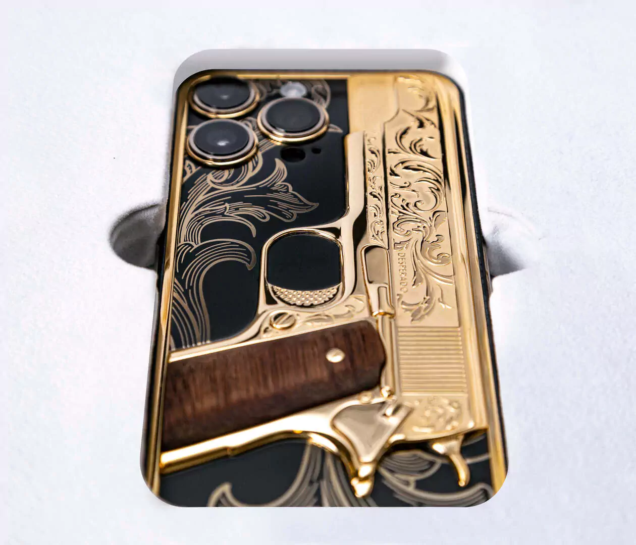 The case includes custom headphones with overlays covered with 24K gold. They go perfectly with the bullet-shaped pendant from Colt 1911 thanks to engravings with Latin American motifs. The same ones decorate Notorious – the most dangerous smartphone with a gun on the phone body. All weapons are decorative and do not pose a threat to people.