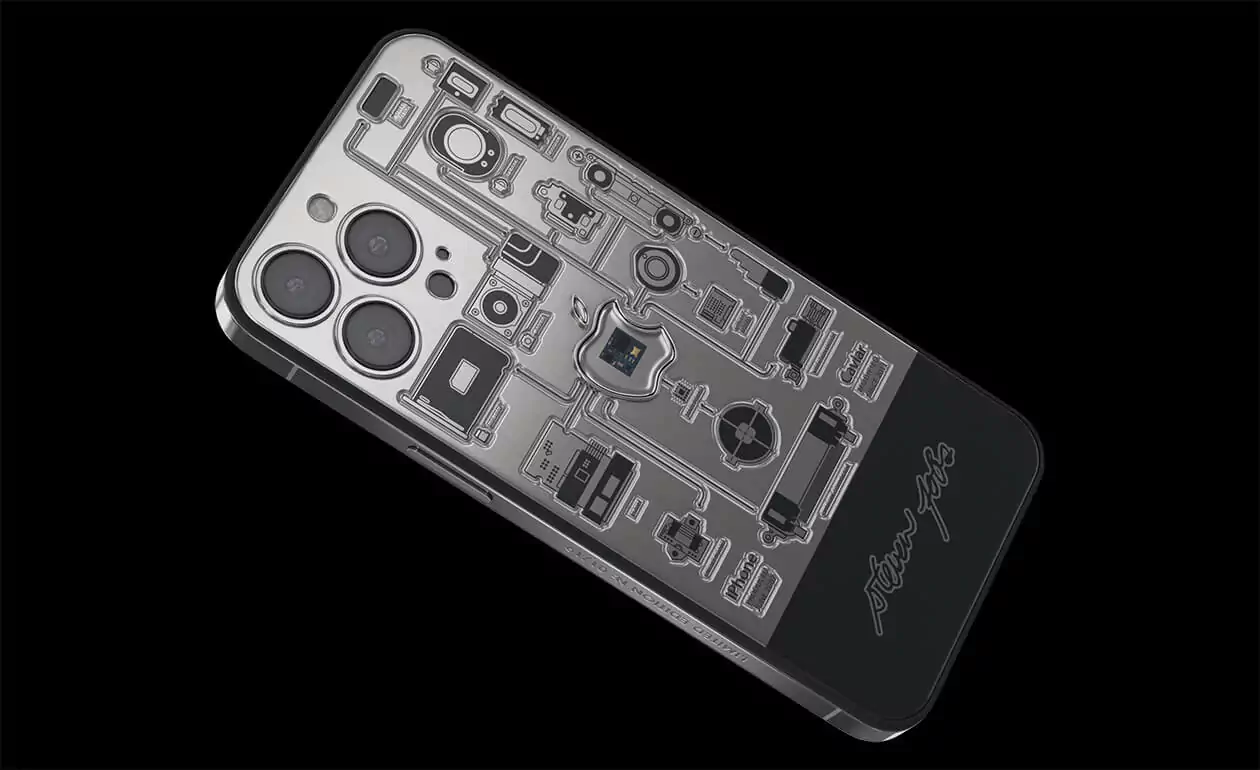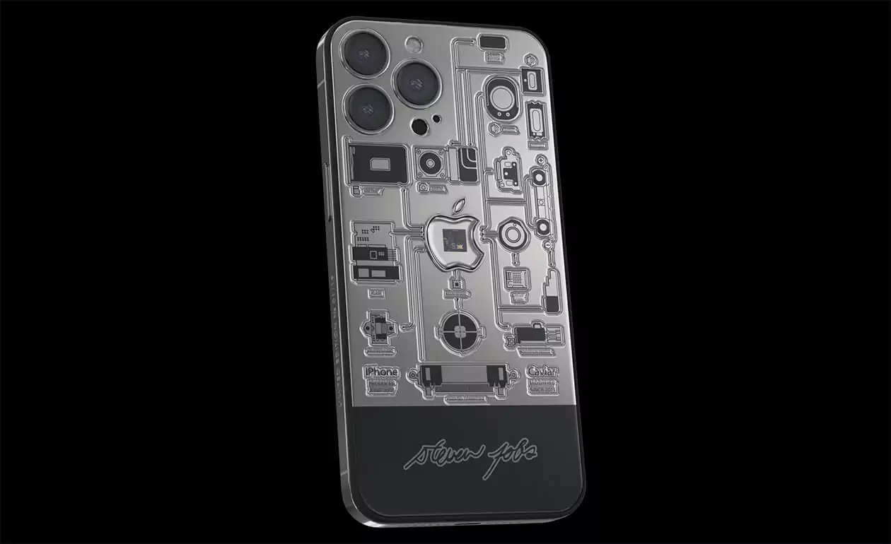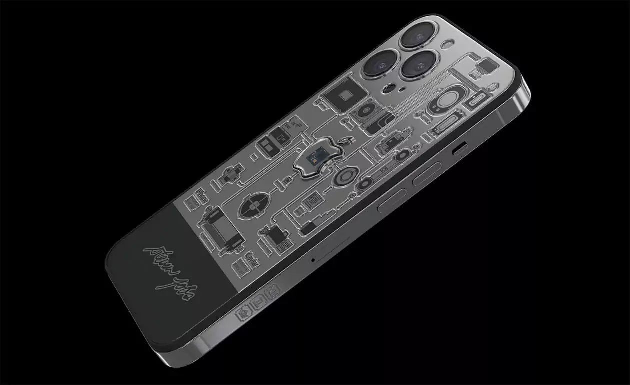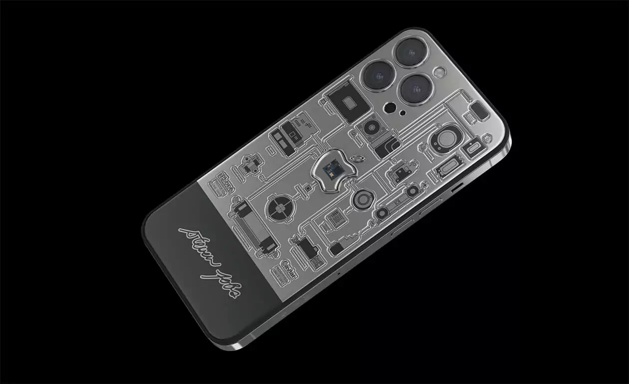 In the center of the case made of aviation titanium, there is a sealed capsule in the form of Apple's branded bitten apple with an embedded fragment of the motherboard of the very first iPhone 2G. The back cover of the smartphone is decorated with high-precision engraving depicting the technical elements of the device, which are connected together. They are striving towards the center of the world - the Apple logo - like a circulatory system pushing blood towards a pulsating heart.