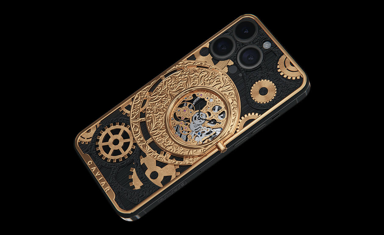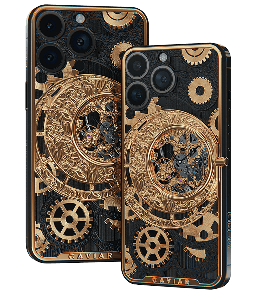 Now, you have not only a modern smartphone at your disposal that has nothing impossible in the technological terms, but also an accurate skeleton watch that dramatically complement a grandiose panel of gilded decorative gears on the back side of the body.