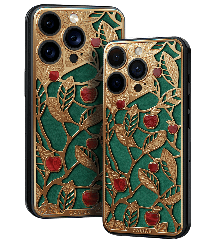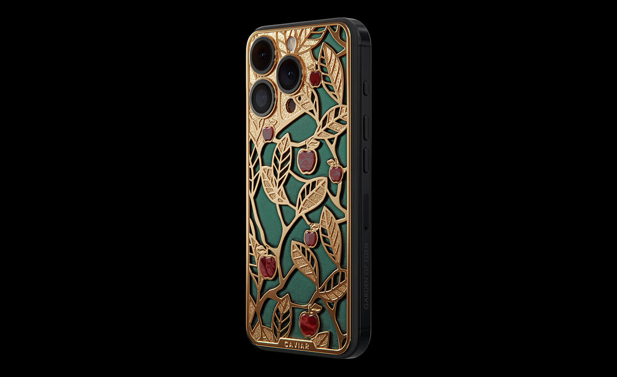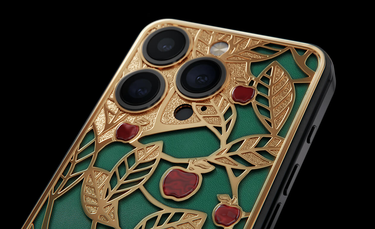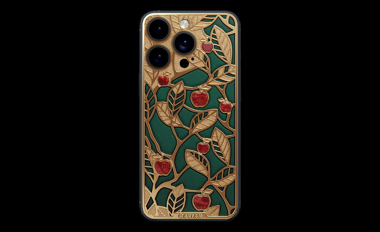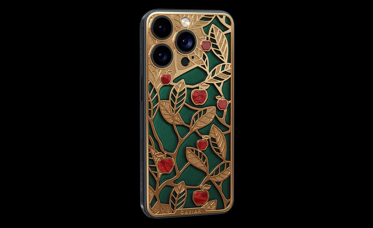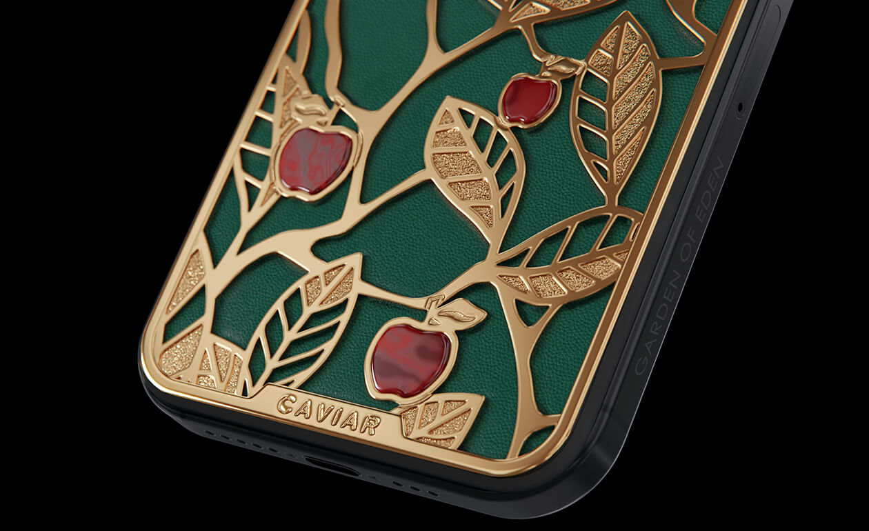 Caviar's sweet apples shine and shimmer in front of you because they are created of a jewelry alloy coated with a double layer of the purest gold (24K). Our jewelers have managed to recreate an amazing combination of red, green and gold colors of the Garden of Eden thanks to the use of green calfskin and inserts of red iridescent composite material on the gold body of the iPhone 17 Pro in the design.