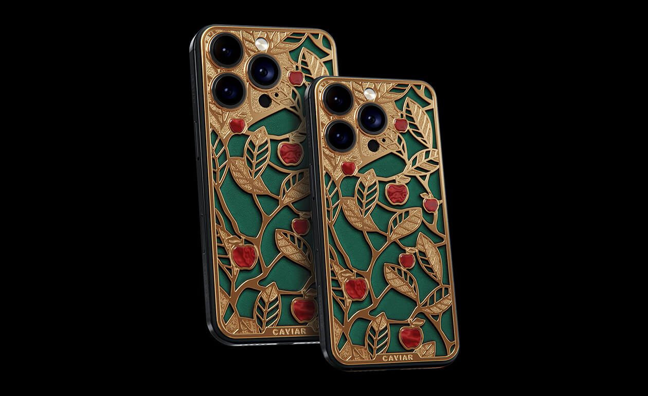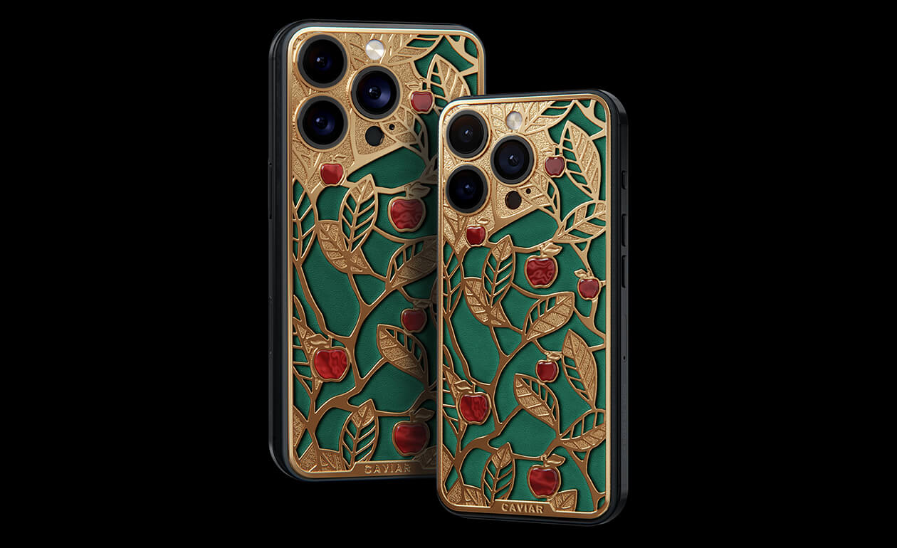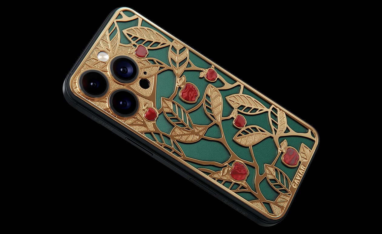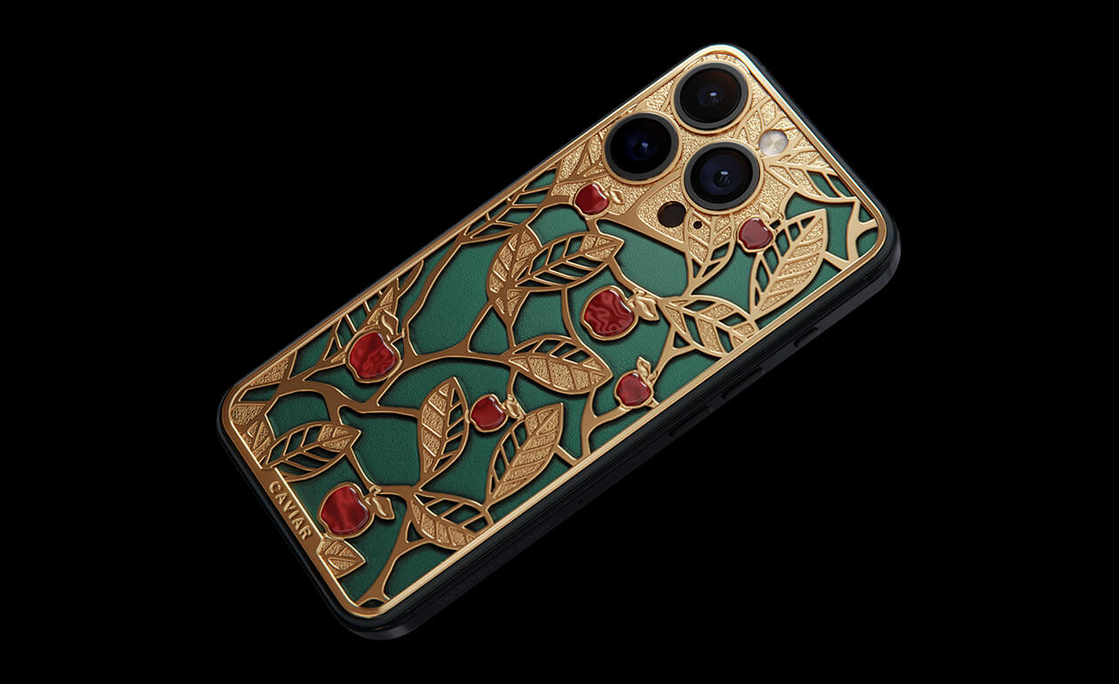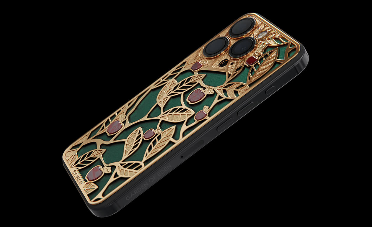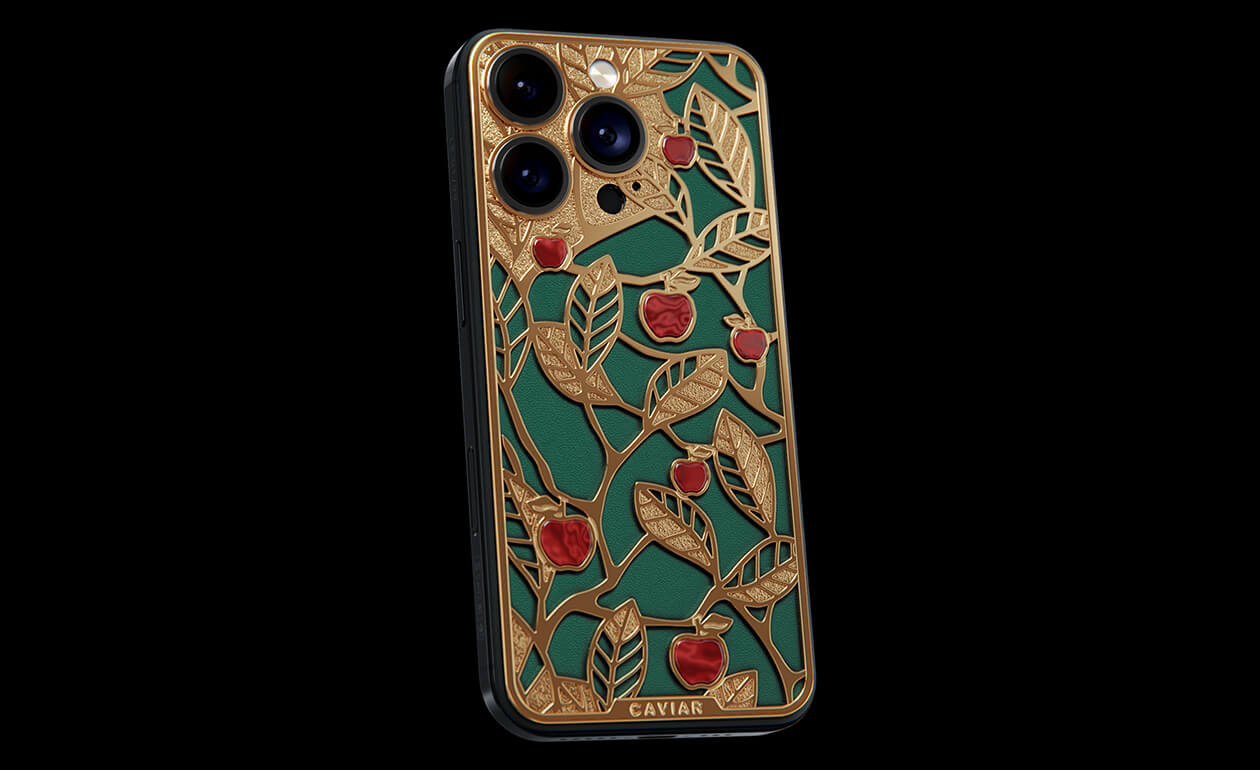 Caviar's sweet apples shine and shimmer in front of you because they are created of a jewelry alloy coated with a double layer of the purest gold (24K). Our jewelers have managed to recreate an amazing combination of red, green and gold colors of the Garden of Eden thanks to the use of green calfskin and inserts of red iridescent composite material on the gold body of the iPhone 17 Pro in the design.
