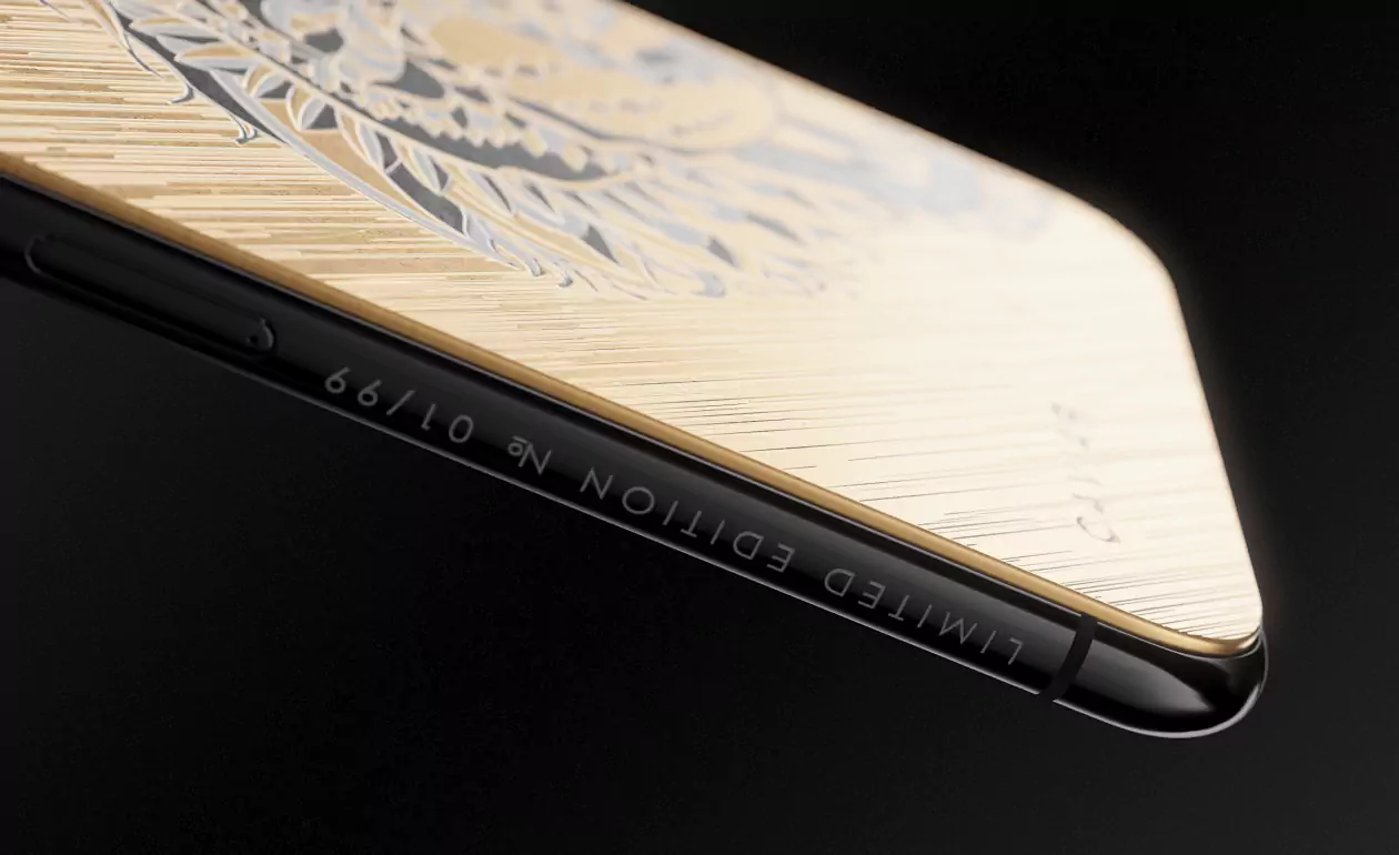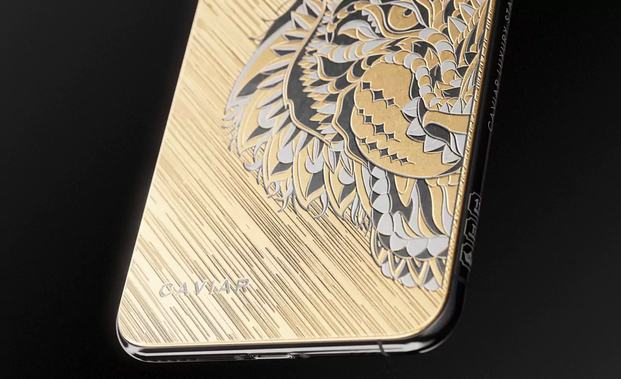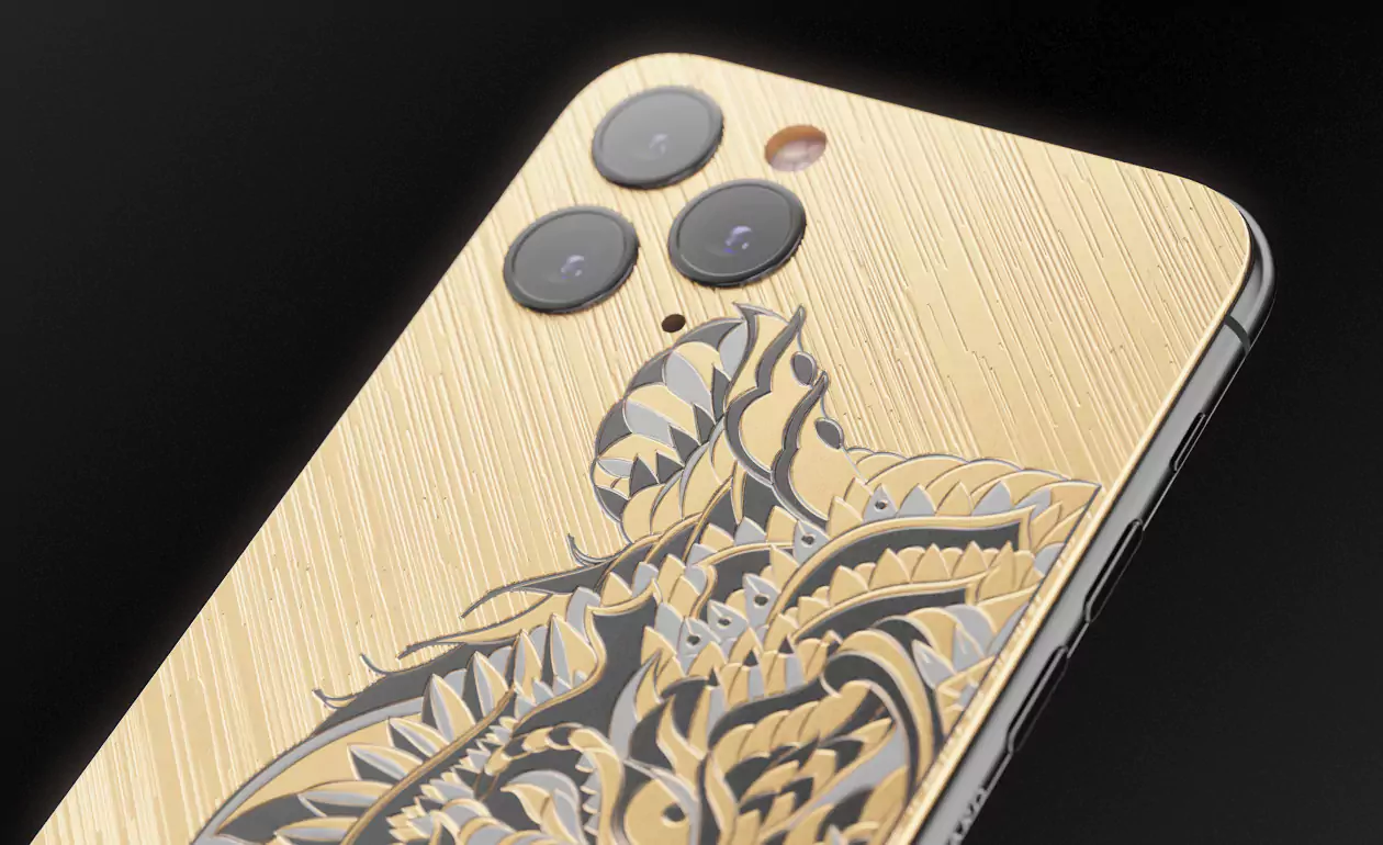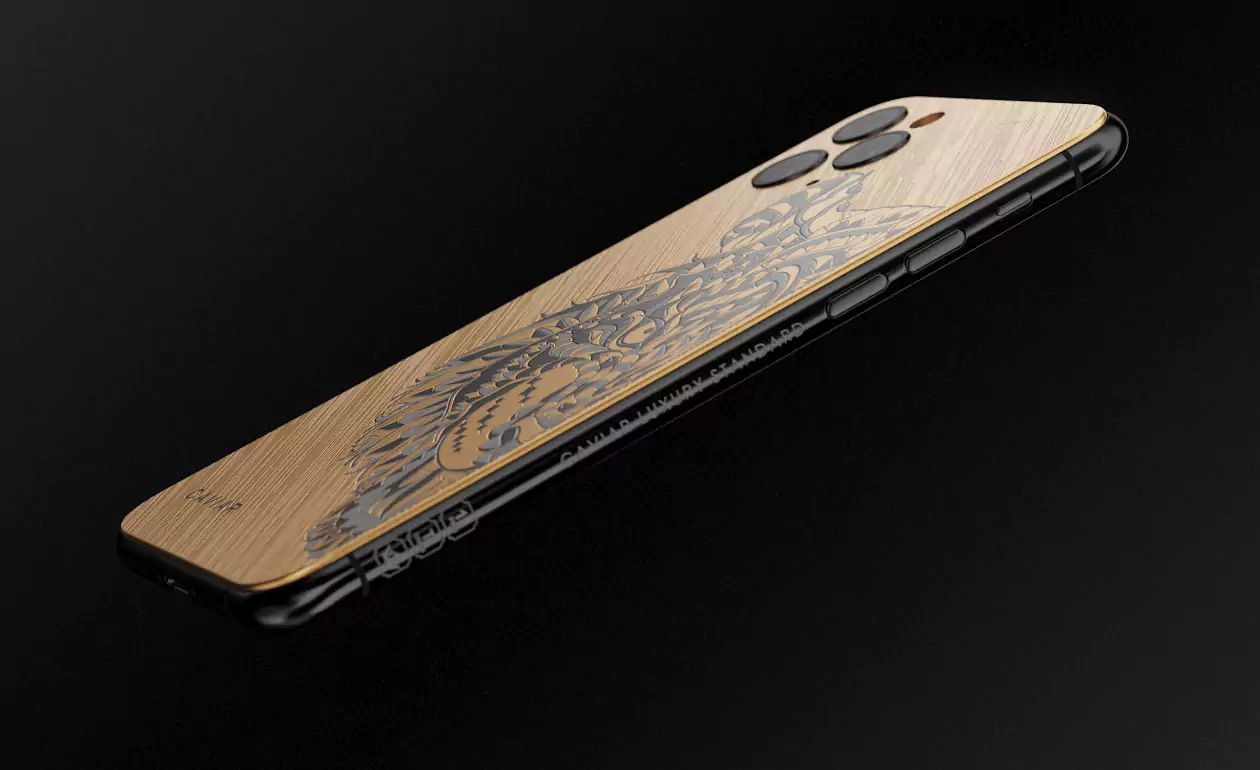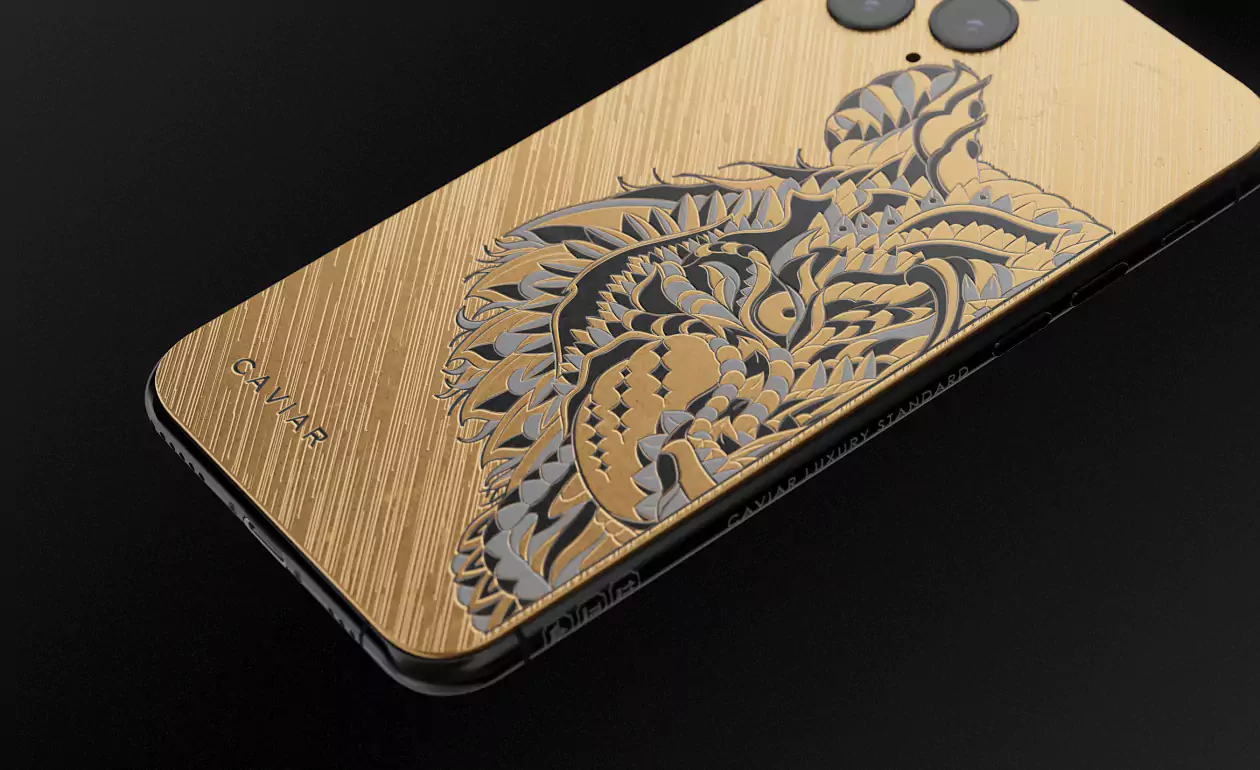 The body of the iPhone 11 Pro is made of titanium with gold PVD covering and decorated with staining. The image of a tiger with a terrifying grin is made in the laser engraving technique on metal.