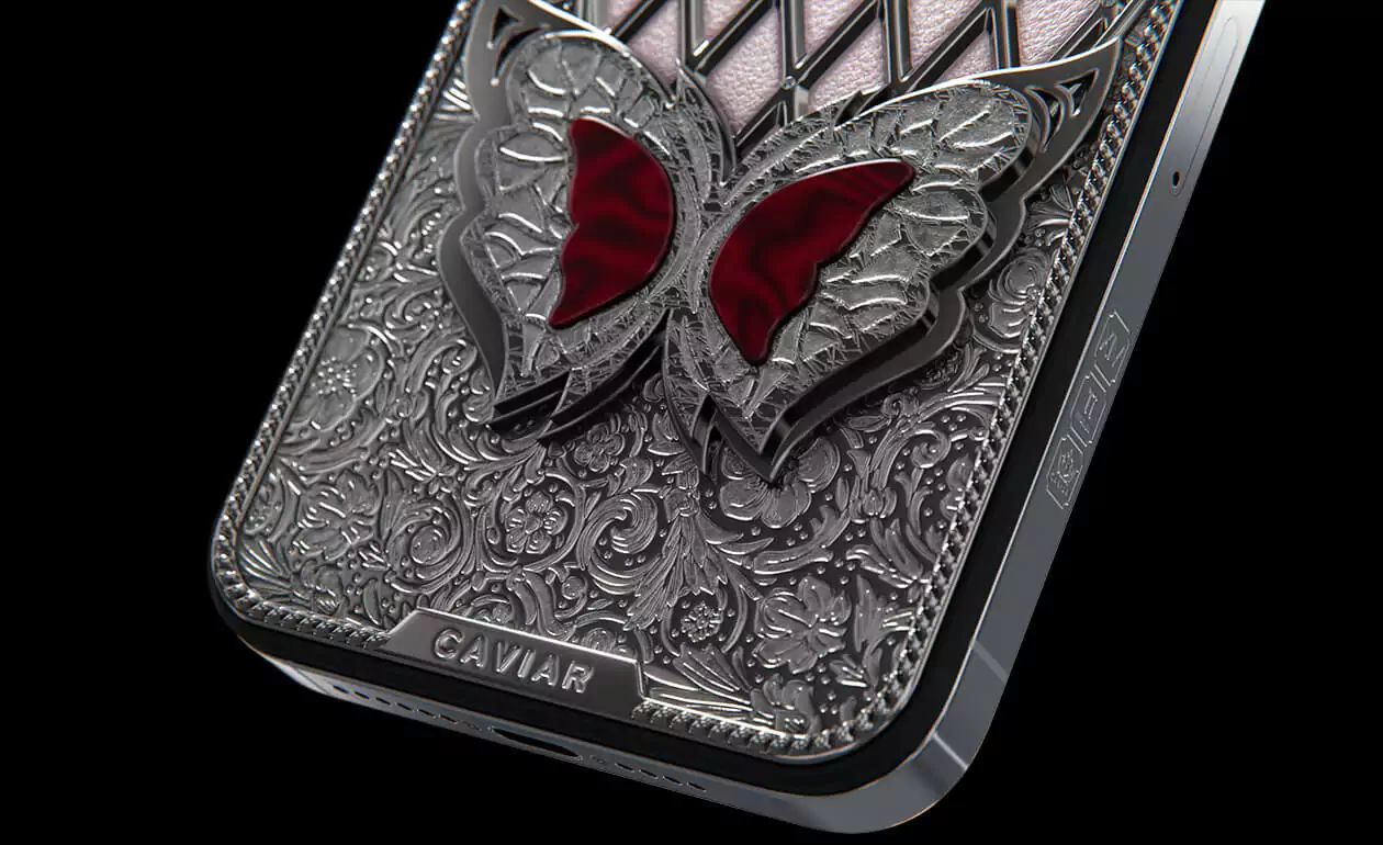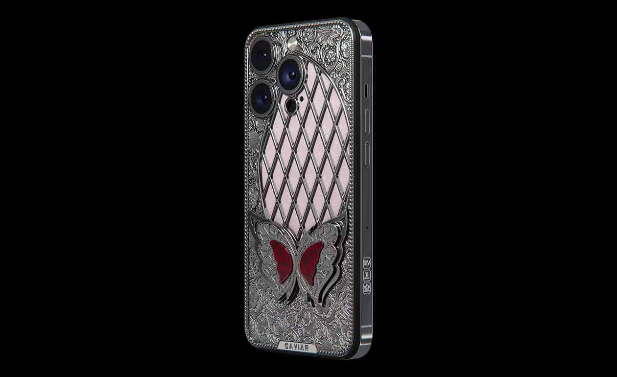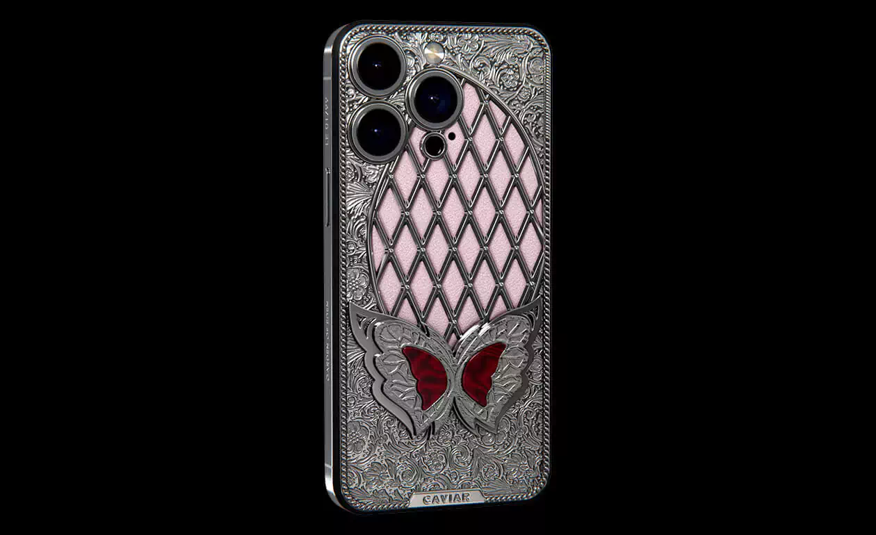 It is the magical Sangria Butterfly sitting on a decorative glade of 24 Swarovski crystal in a new design by Caviar. Her blood-red wings are in good harmony with the silver frame and pale pink calfskin at the base of the panel.