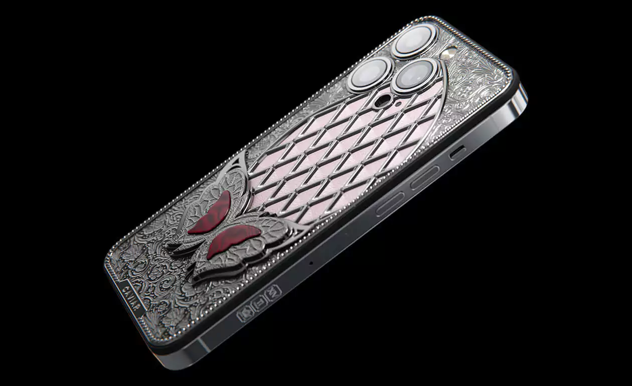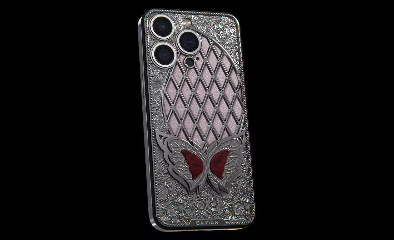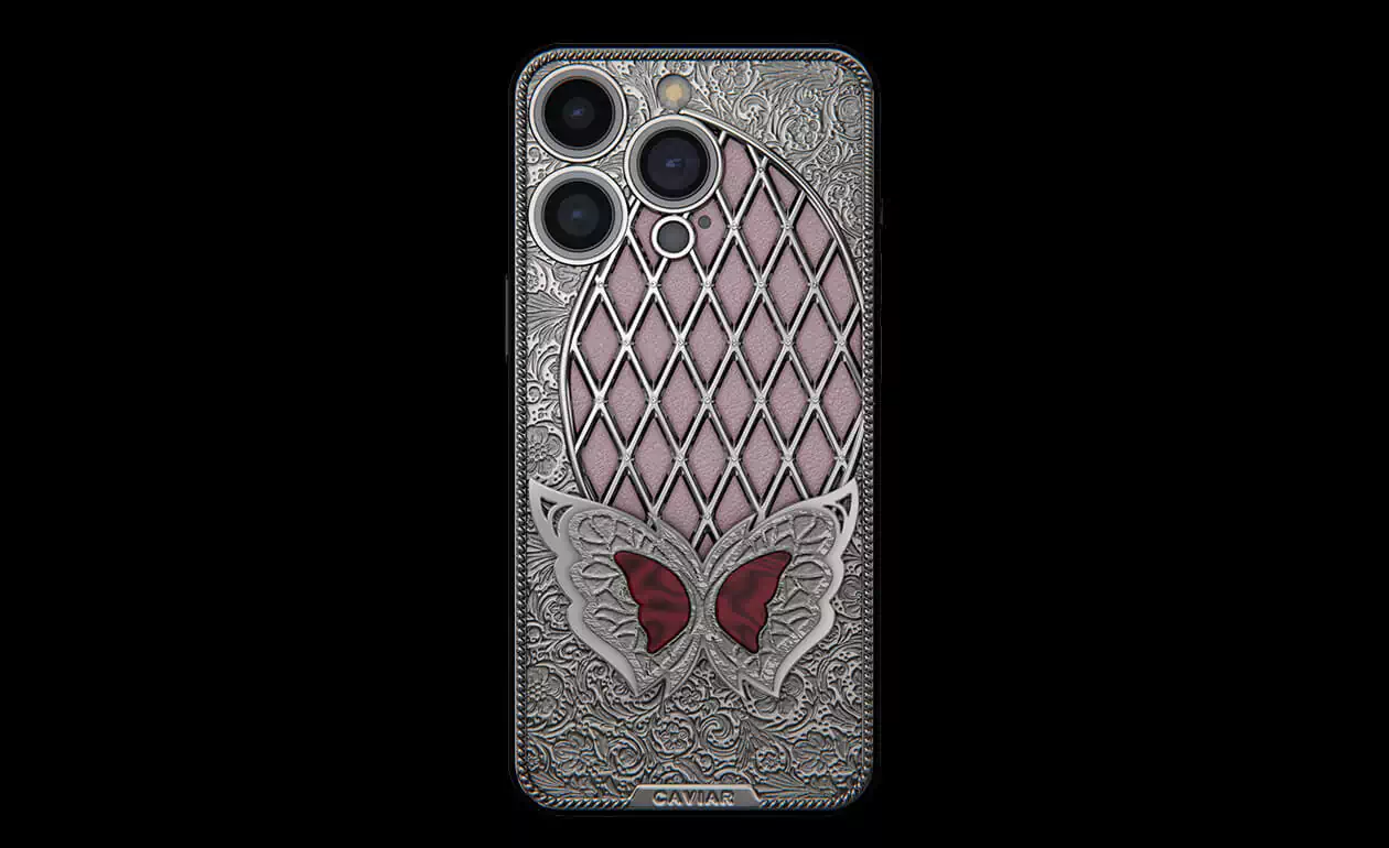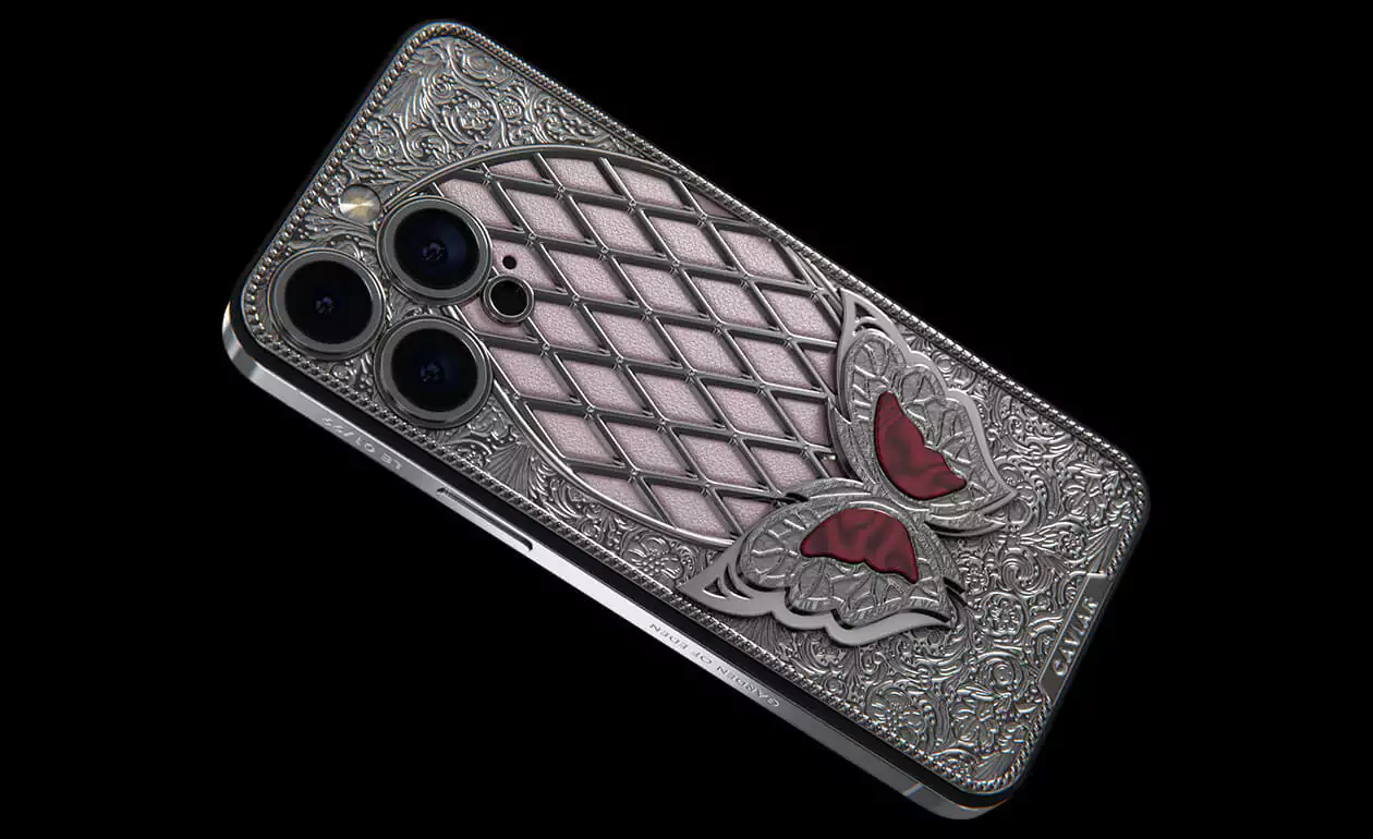 It is the magical Sangria Butterfly sitting on a decorative glade of 24 Swarovski crystal in a new design by Caviar. Her blood-red wings are in good harmony with the silver frame and pale pink calfskin at the base of the panel.