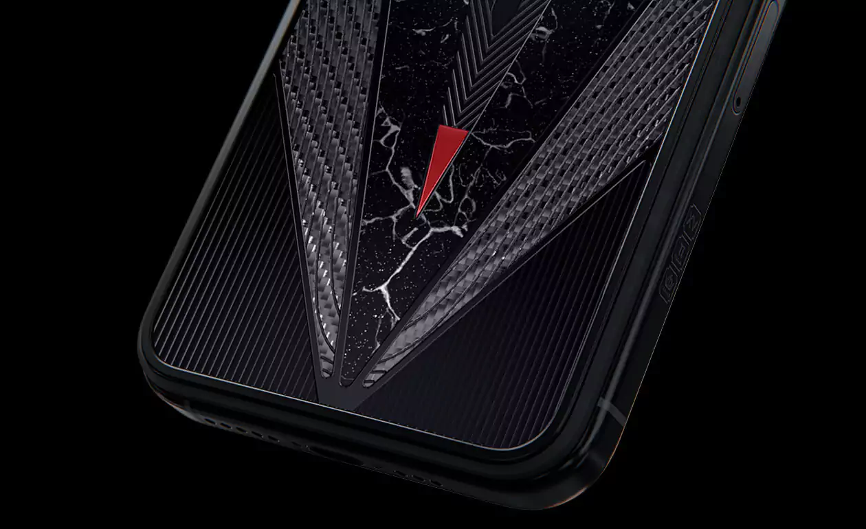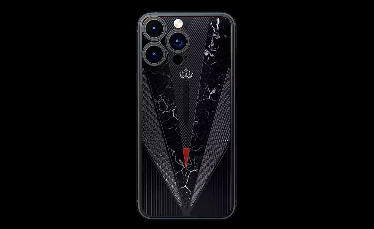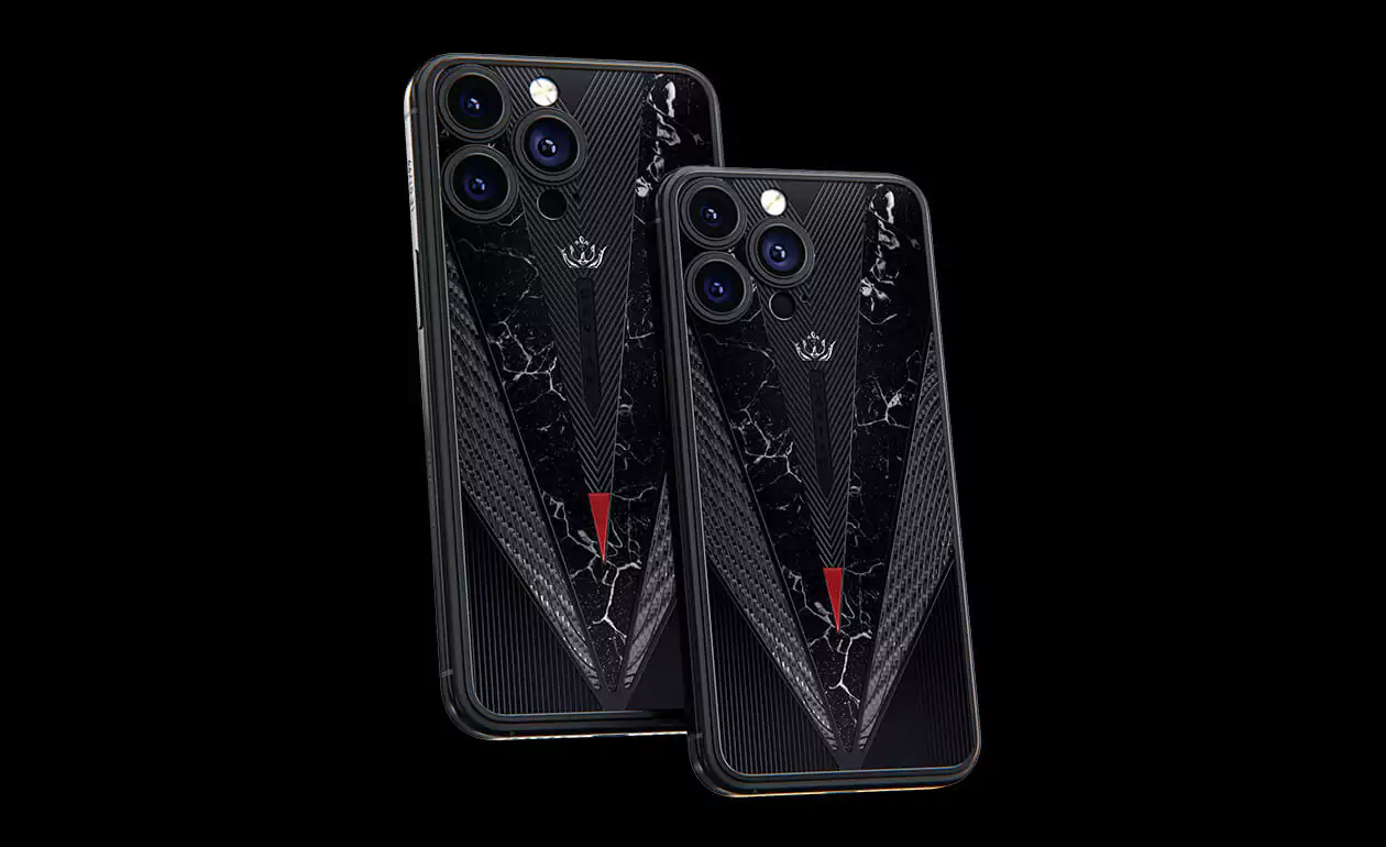Masculine and slightly soldierly duet of titanium and carbon immediately draws attention to the owner of the gadget. An imitation of a sword with a drop of blood on the tip and black titanium details make the accessory even more dynamic and solid. The combination of black and red looks aggressive, impressive and royal, bringing back the cruel era of the Middle Ages, the time of fearless heroes.