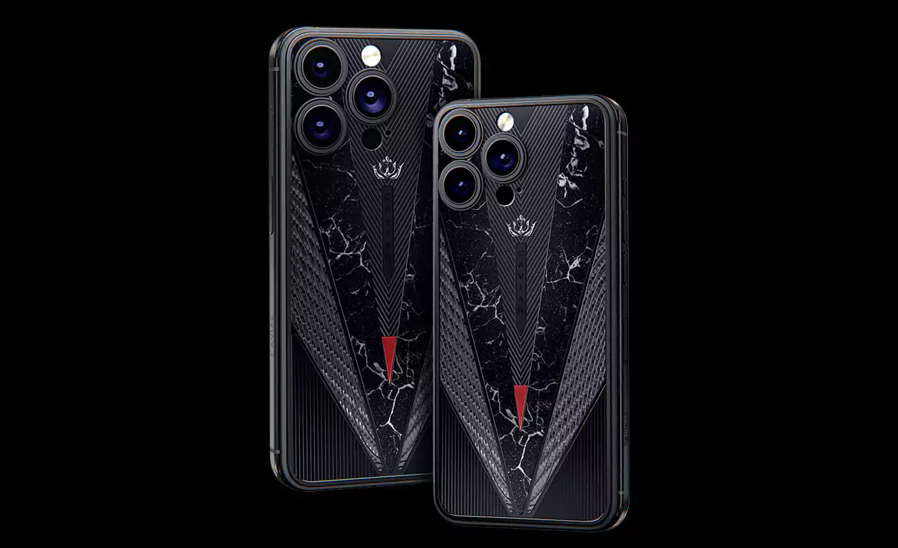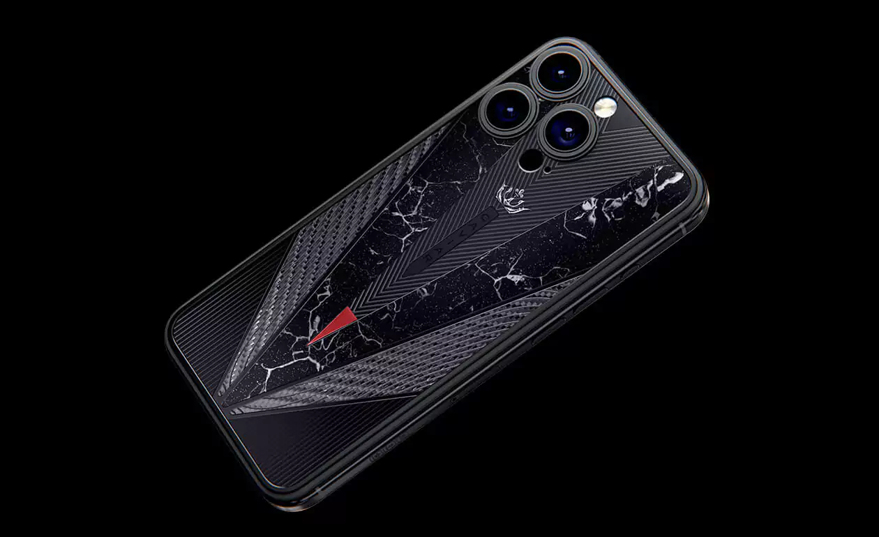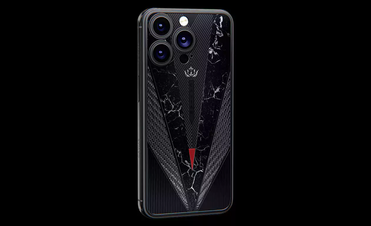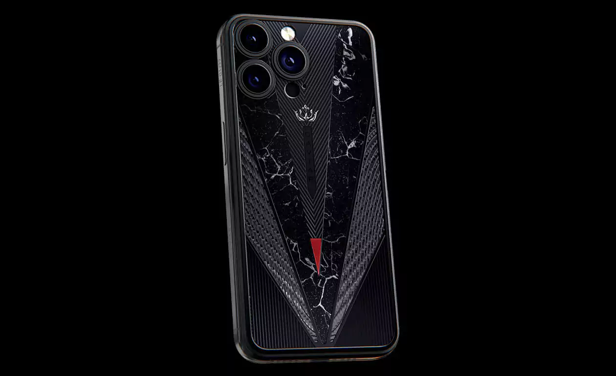 Masculine and slightly soldierly duet of titanium and carbon immediately draws attention to the owner of the gadget. An imitation of a sword with a drop of blood on the tip and black titanium details make the accessory even more dynamic and solid. The combination of black and red looks aggressive, impressive and royal, bringing back the cruel era of the Middle Ages, the time of fearless heroes.