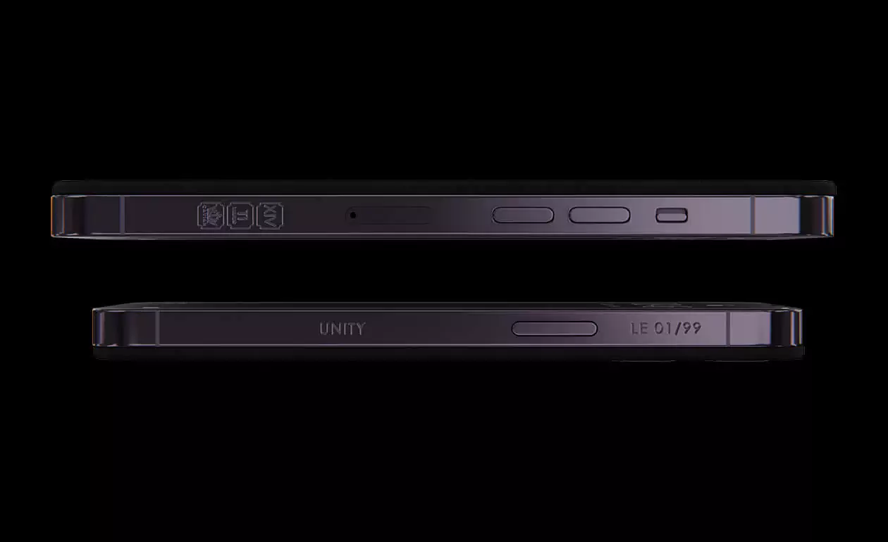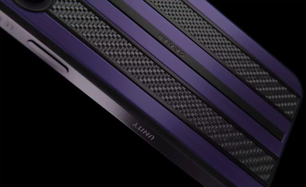 Like all models from the new collection Unity, this smartphone carries the idea of the upward movement towards all the best. Its body is made of black titanium with carbon reinforcement inserts in purple color. This feature distinguishes the design developed by Caviar masters.