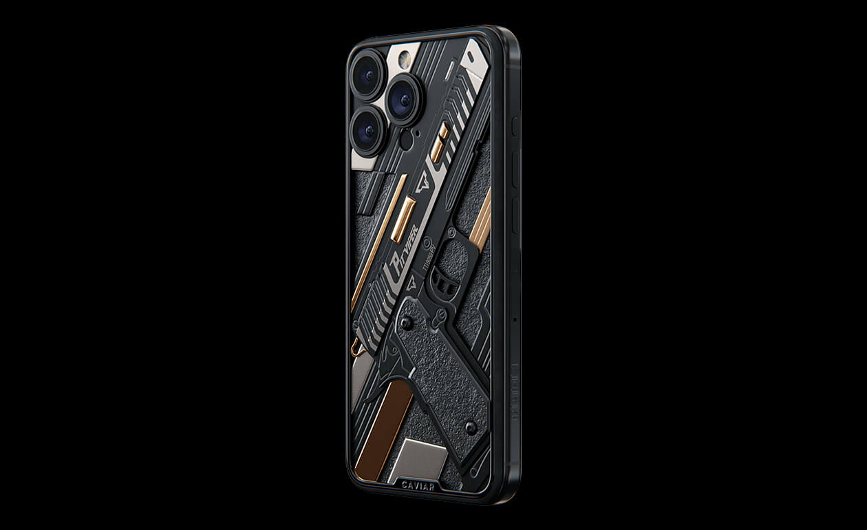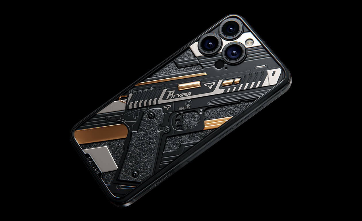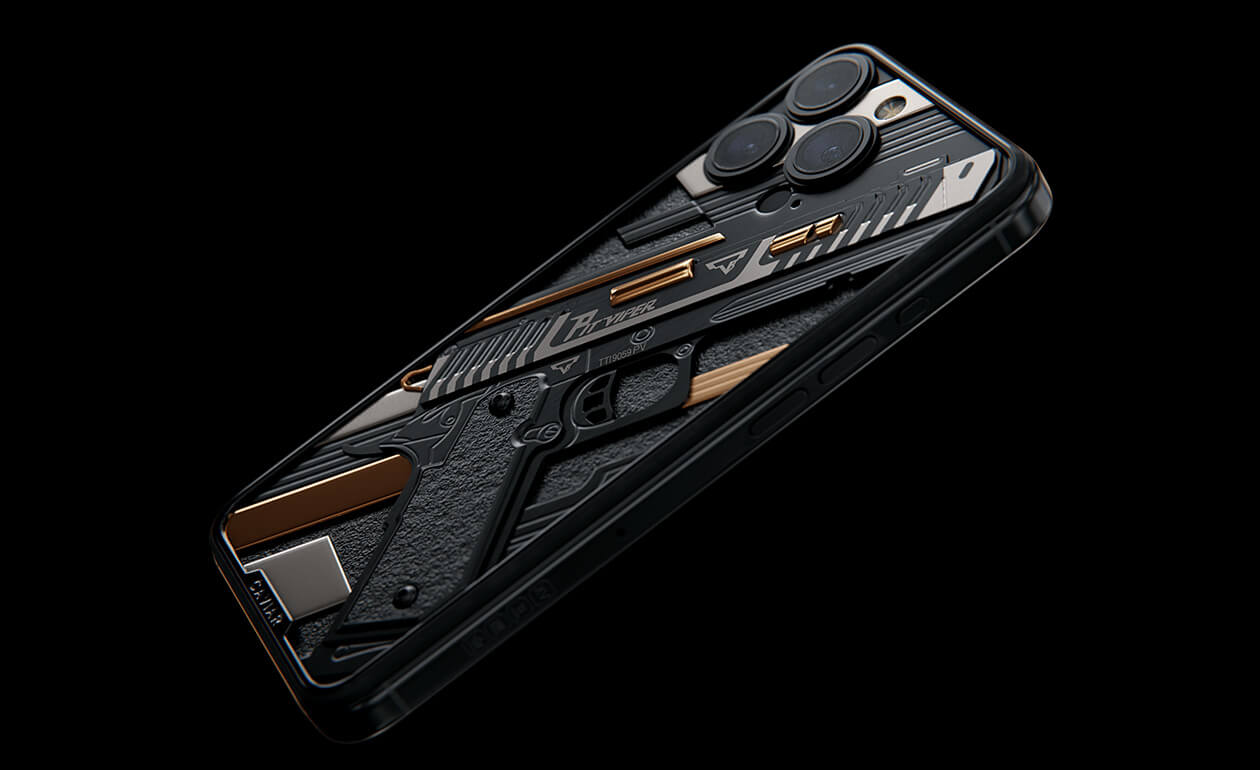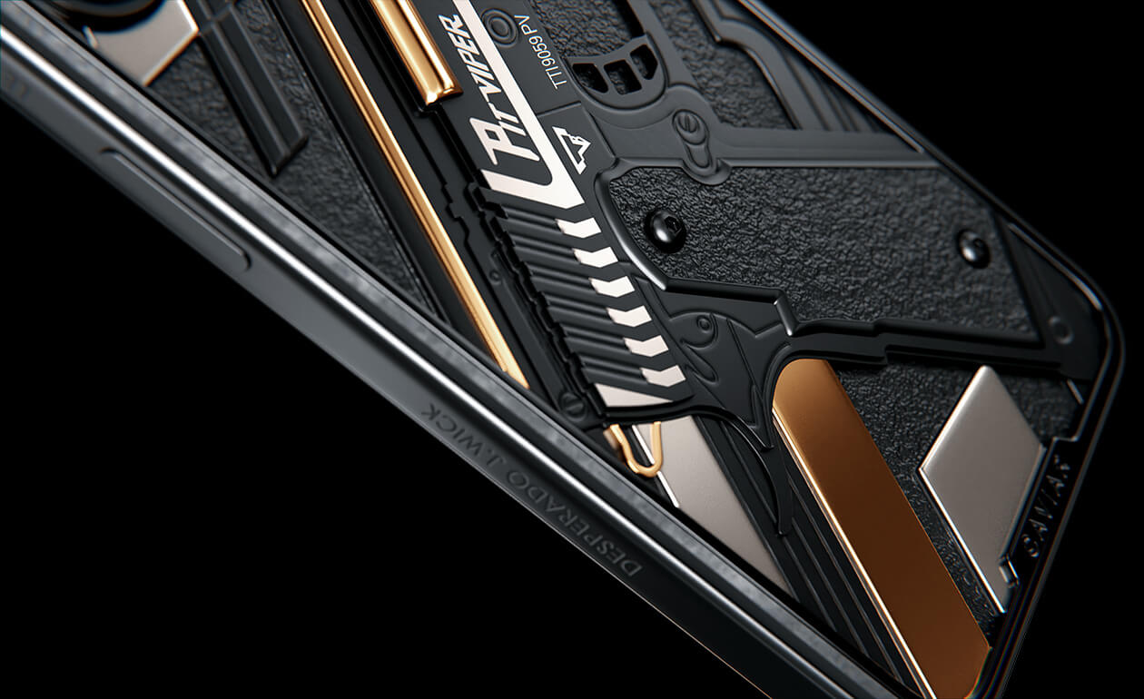 Introducing the iPhone 17 Pro Viper, showcasing John Wick's formidable weaponry. The design of this custom device embodies the style and precision of the professional assassin. Every detail is crafted from luxurious materials to convey the atmosphere of the iconic action movie. The titanium parts of the gun are coated with PVD, just like in the finest Swiss watches, and some elements are adorned with 24K gold.
