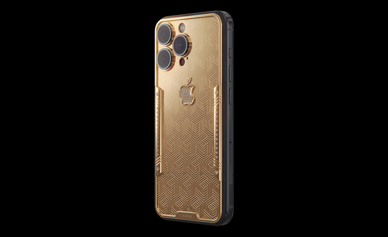 Geometry of luxury on the iPhone's body. Intertwining lines symbolizing the pursuit of perfection. Caviar's masters enhanced the golden splendor with a scattering of crystals. At the center lies a precious apple made of crystal mosaic.