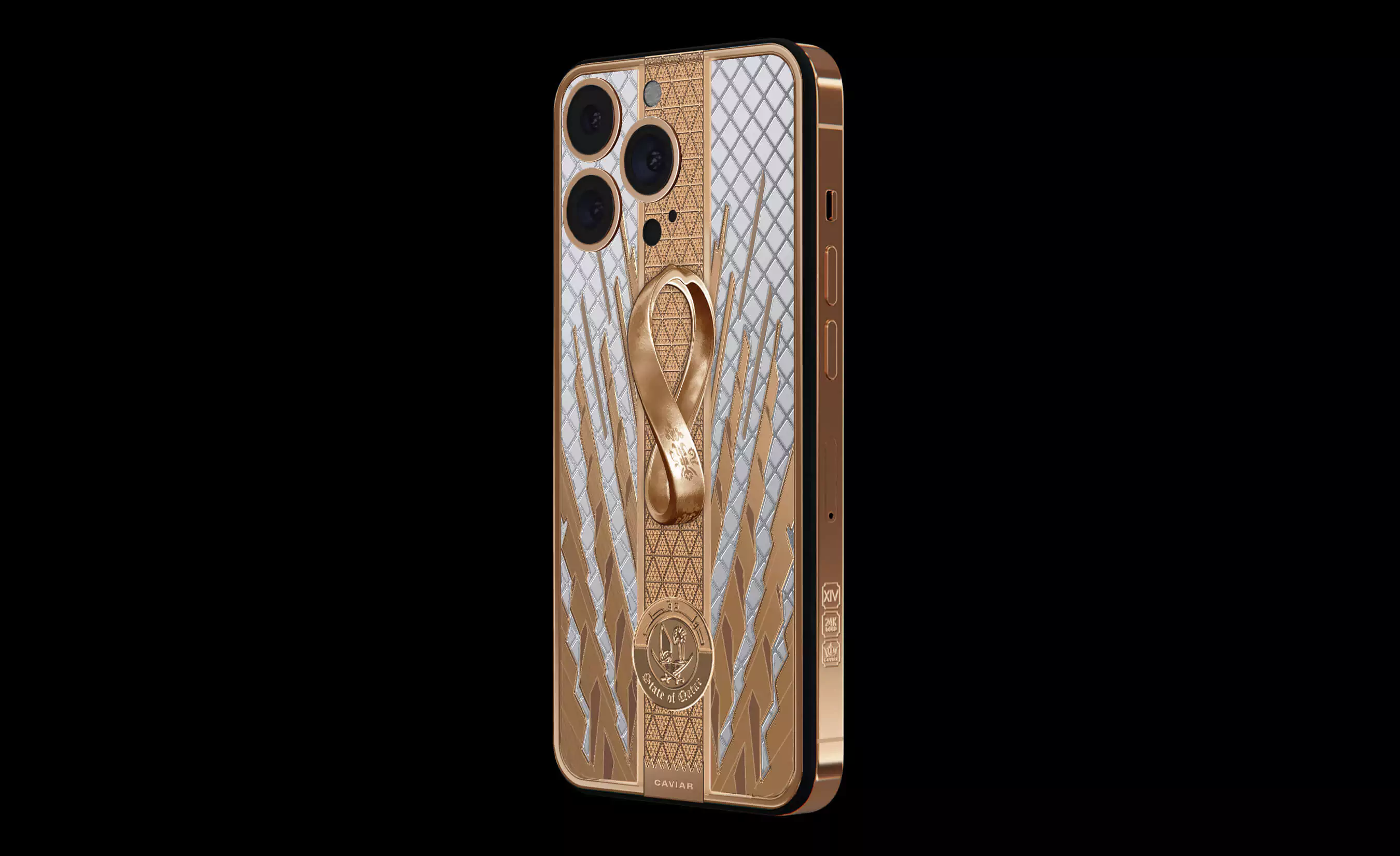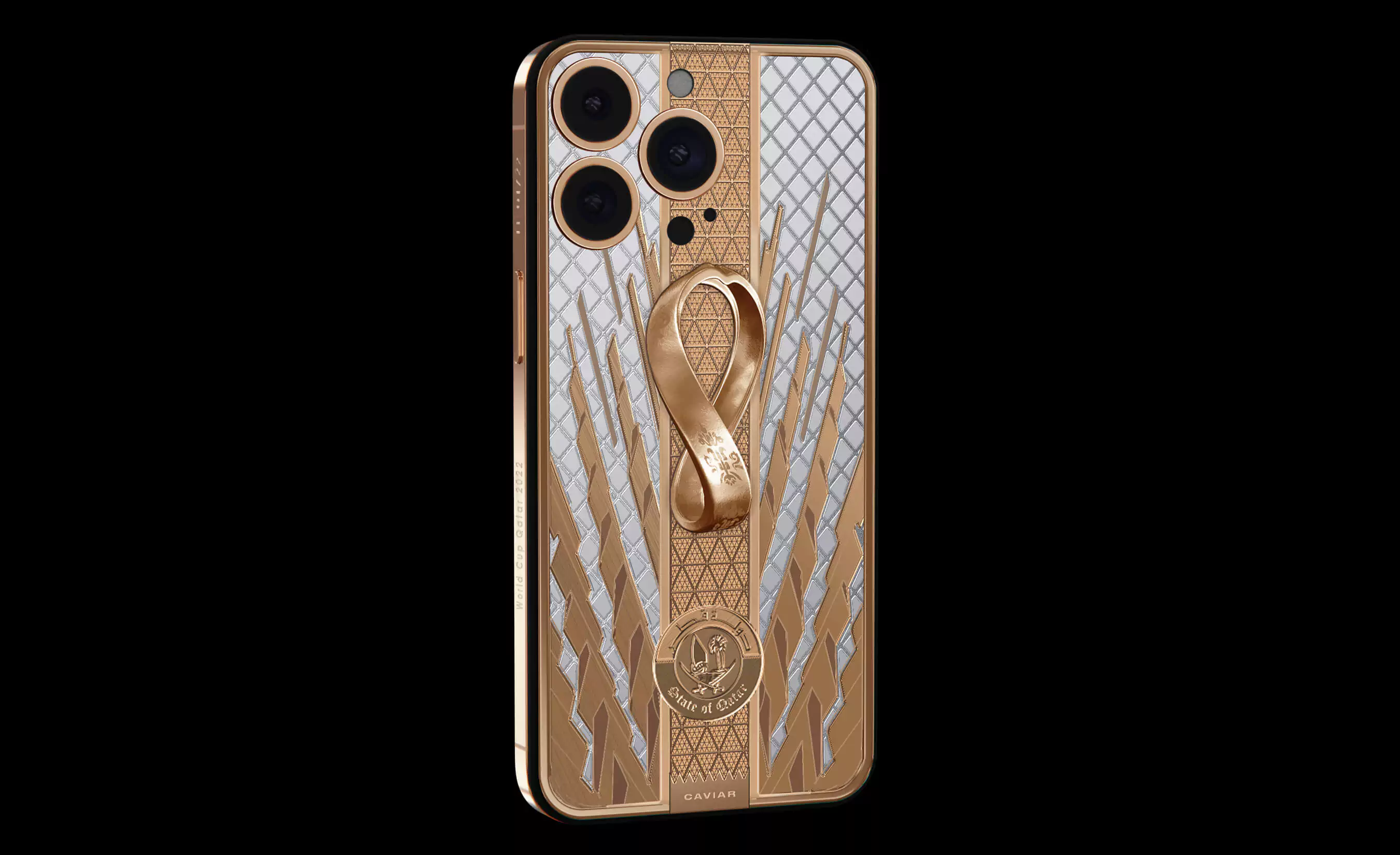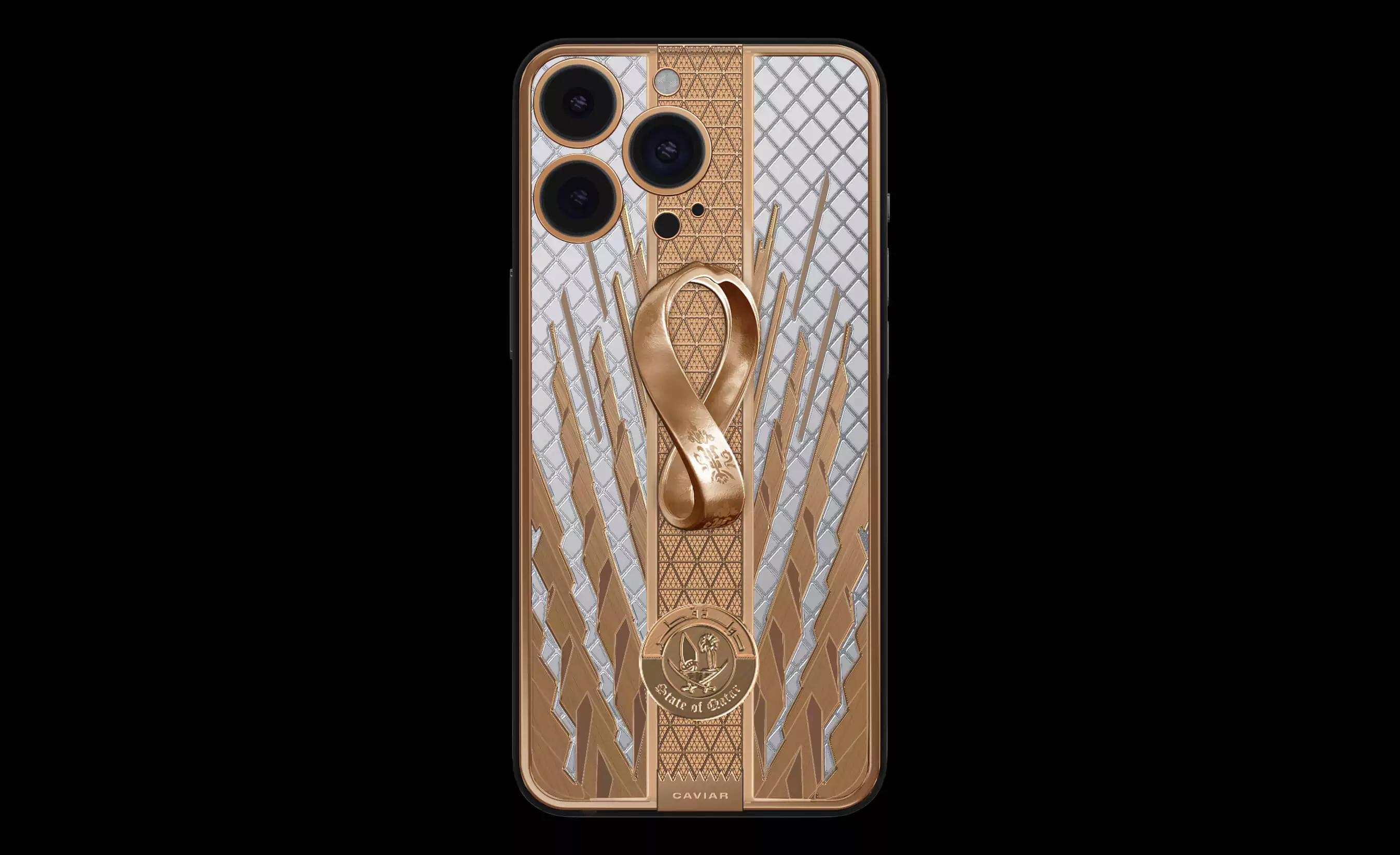 The case of the smartphone is designed in the style of the beautiful golden Lusail Iconic Stadium, which will host the final match of the world football championship. In the center of the composition there is a three-dimensional emblem of the championship - a ribbon with Arabic symbols, twisted in the form of the number eight as a sign of harmony and infinity. It is cast from 18K gold. Decorative patterns inspired by Qatari historical architecture and new football stadiums are made of 18 carat gold.