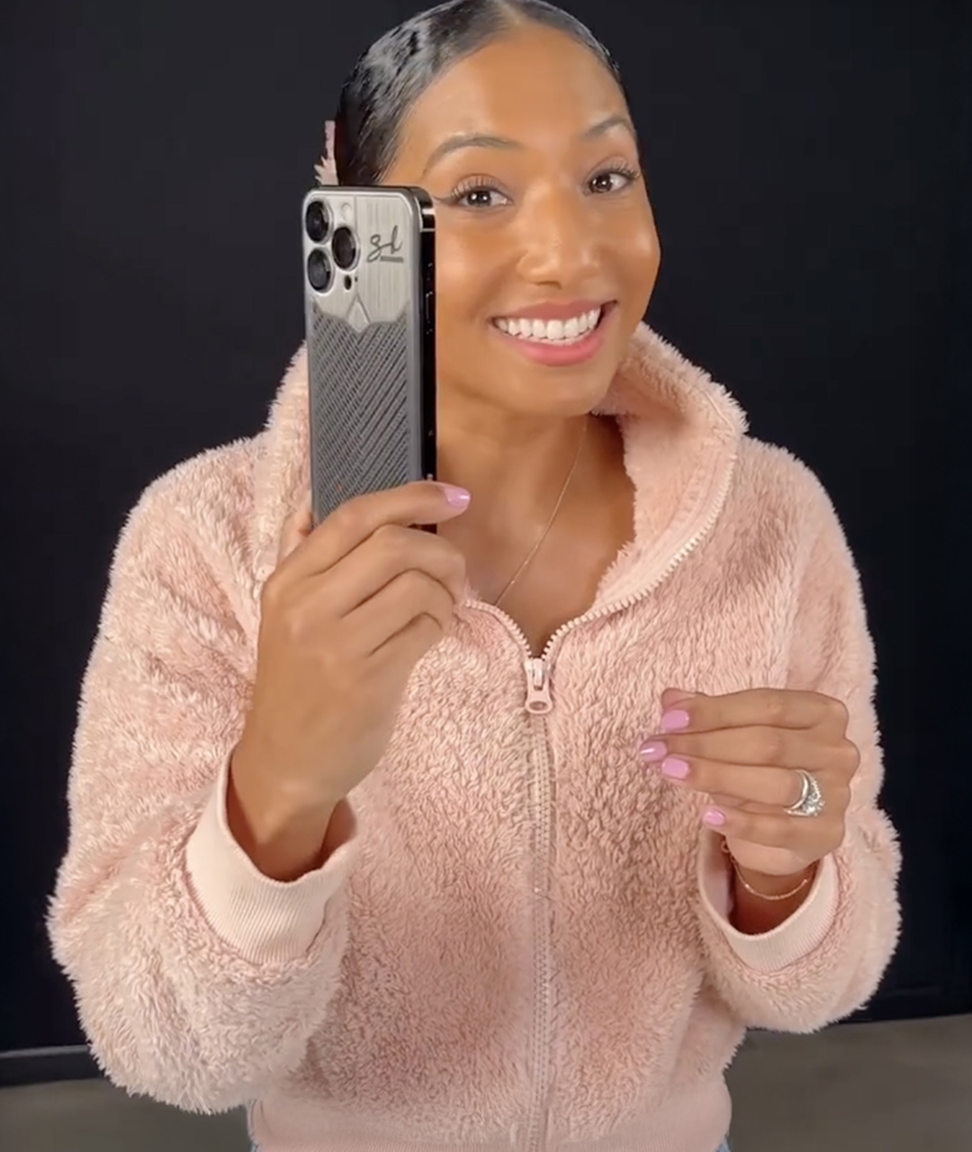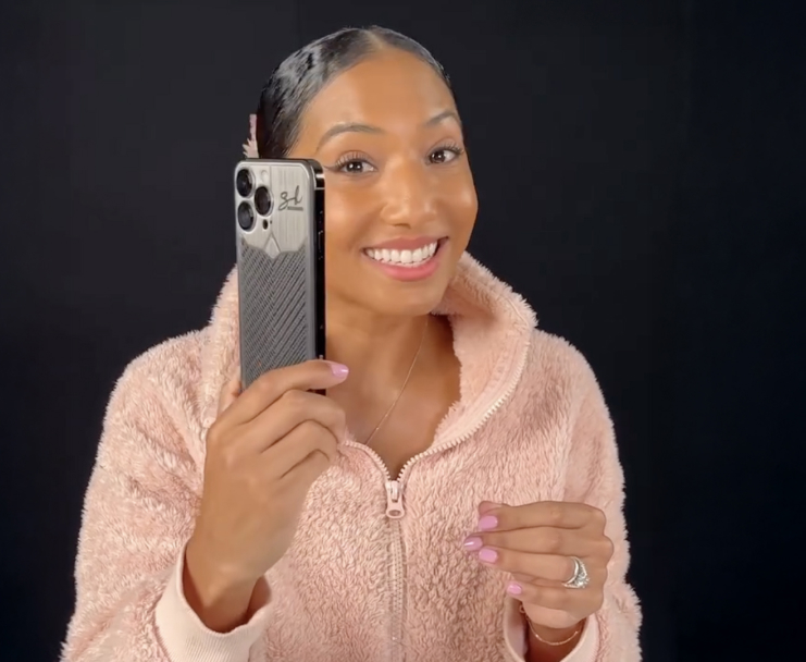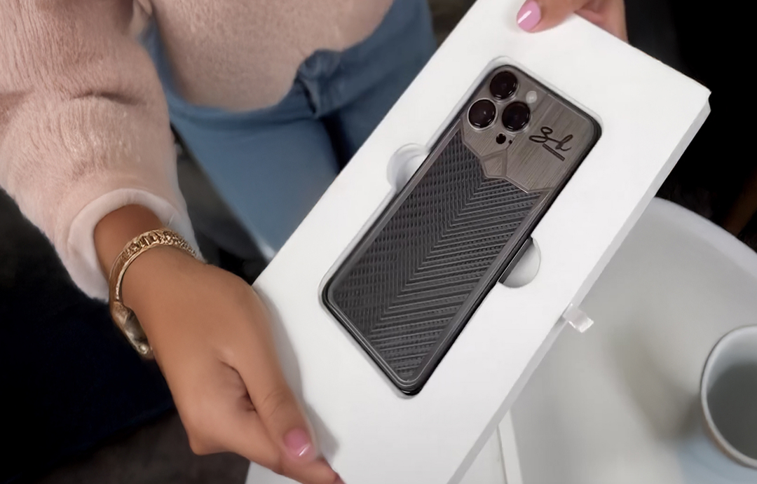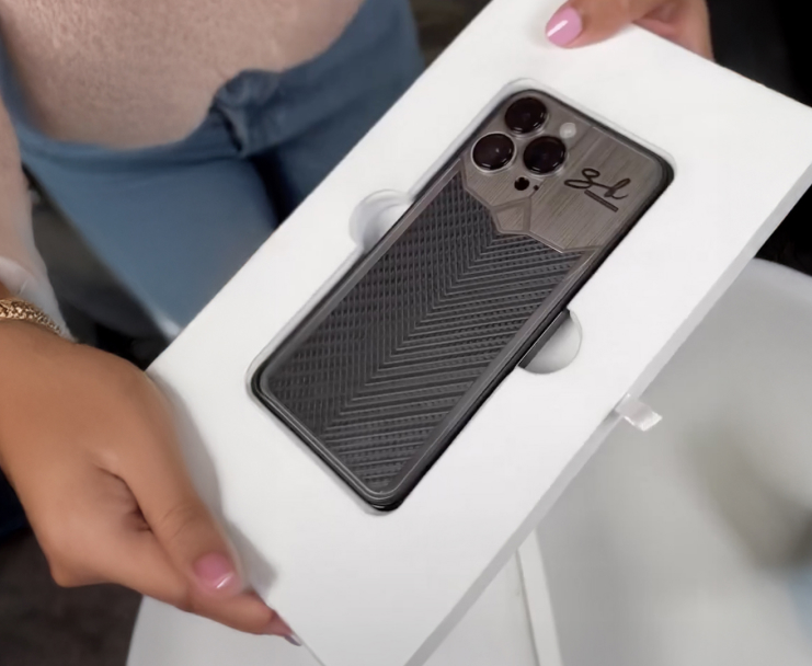 The phone is made from titanium and carbon — the same materials used in hypercar bodies and F1 racers. It’s lightweight, durable, and visually striking. With sleek geometric lines, industrial textures, and custom engraving of her initials, the smartphone becomes a true design object.