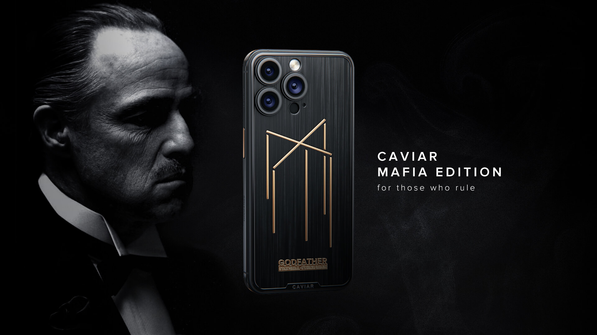 The flagship model of the collection is called Godfather. Black titanium with gold accents, the name "Godfather," and a quote from the eponymous film, "It's not personal, it's strictly business," make it a relic for fans of gangster films and masculinity.