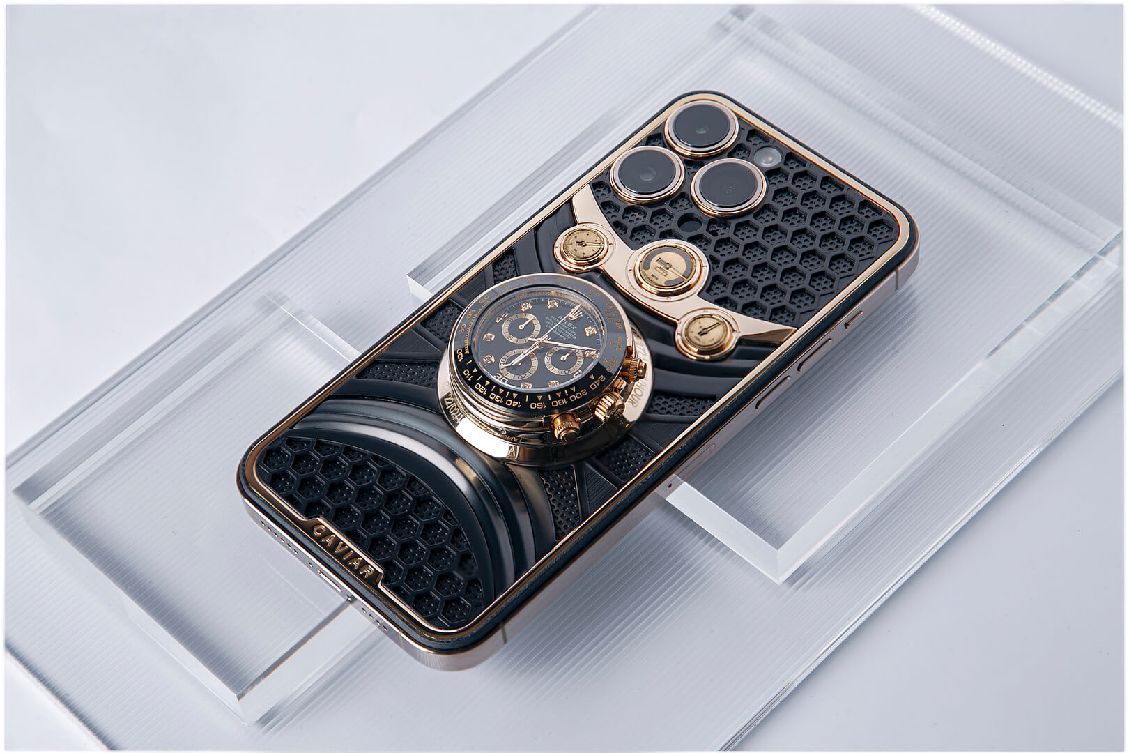 It took 1,5 months to craft the very first iPhone 14 Pro with a built-in Rolex Daytona to show the world that no engineering ideas are impossible. However, the integration of the Rolex watch into the iPhone is just one facet of the overall artistic composition. Caviar pays homage to the heritage of the Rolex Daytona collection by designing the phone body in the style of the 1930s racing cars. The inclusion of intricate 18K gold speedometers and switches on the phone's surface creates a visual representation of a supercar's dashboard, marking the birth of the esteemed Rolex Daytona collection.