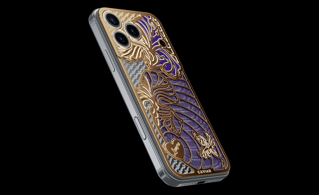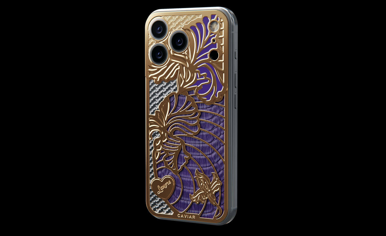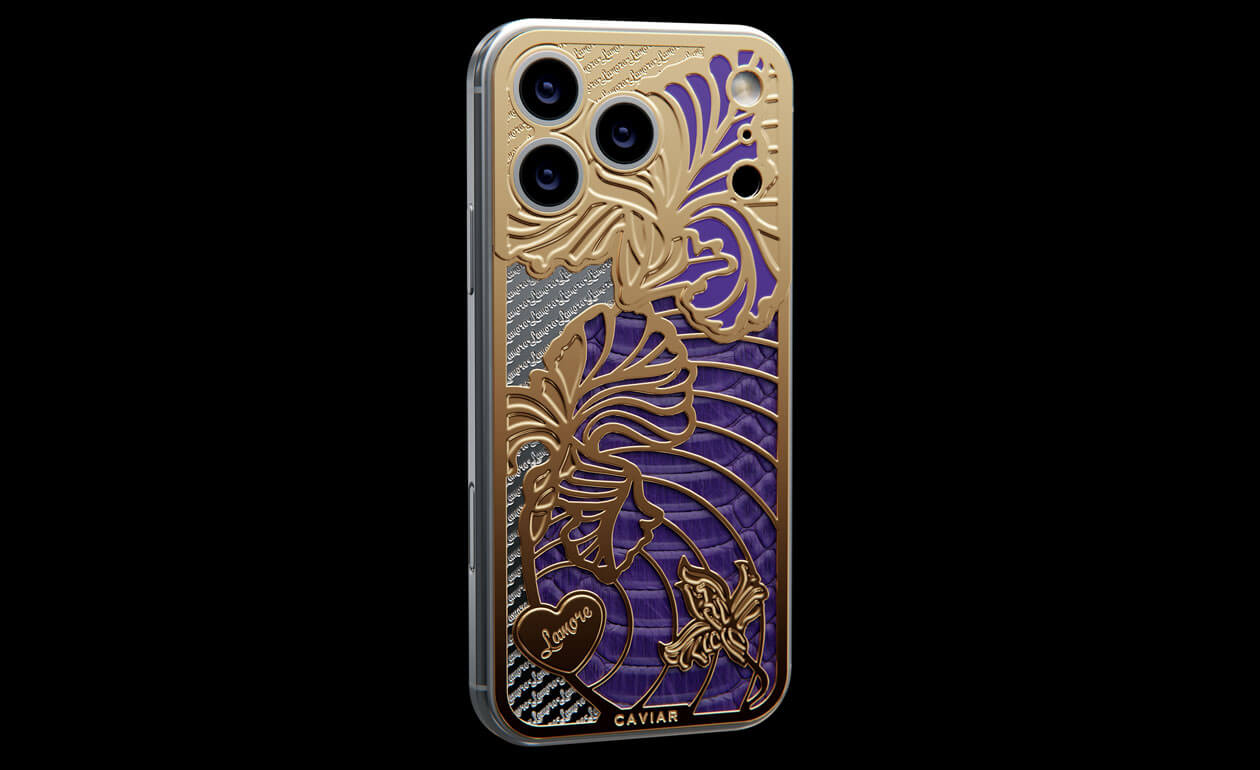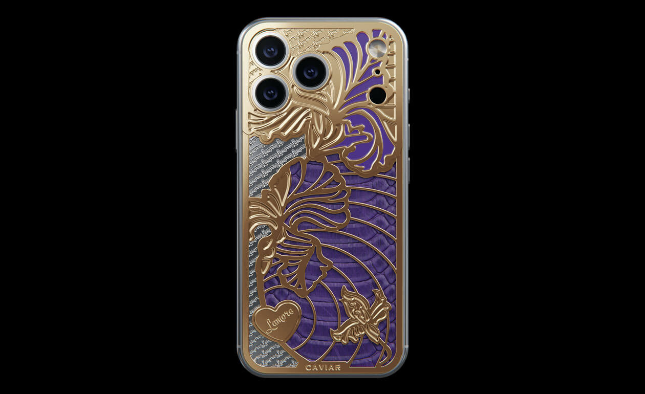 A delicate iris has bloomed on the body of the iPhone. This jewelry design is adorned with petals covered with 24-karat gold and violet python leather.