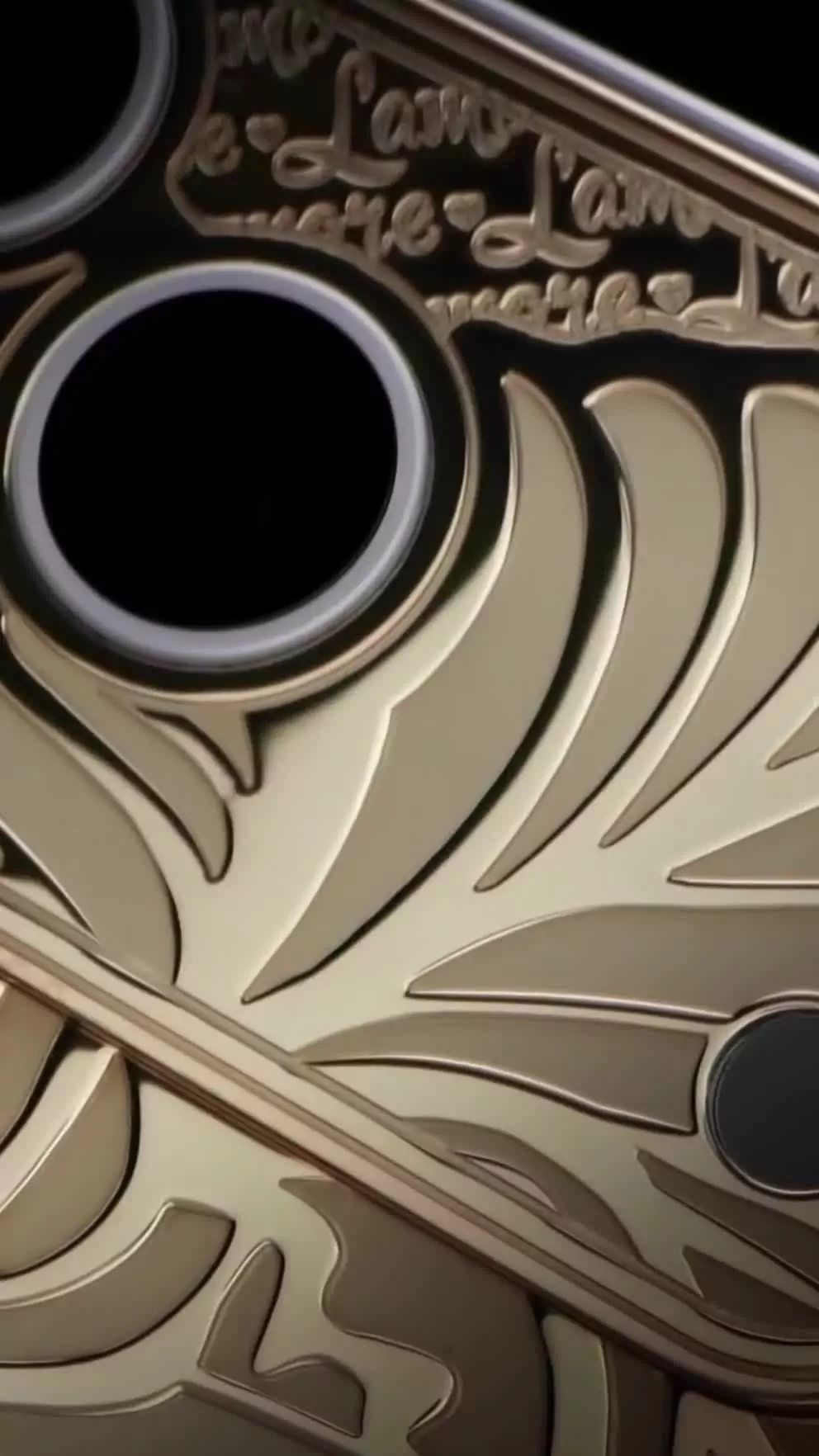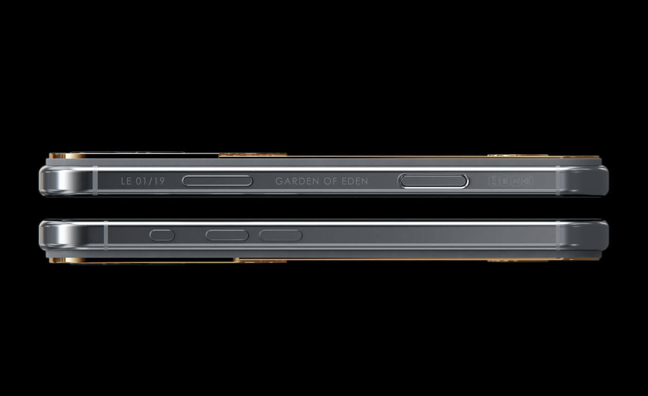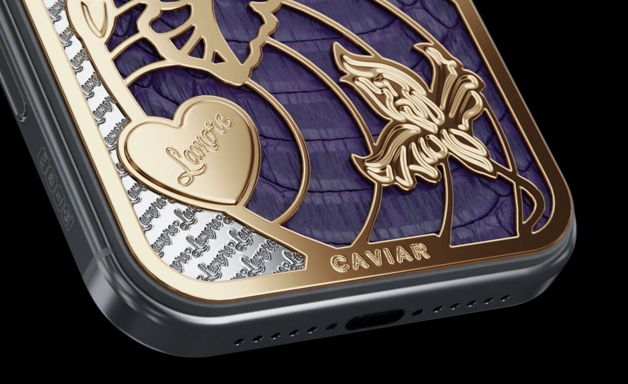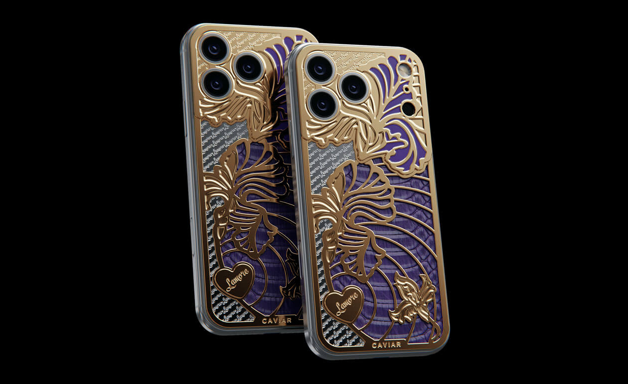 A delicate iris has bloomed on the body of the iPhone. This jewelry design is adorned with petals covered with 24-karat gold and violet python leather.